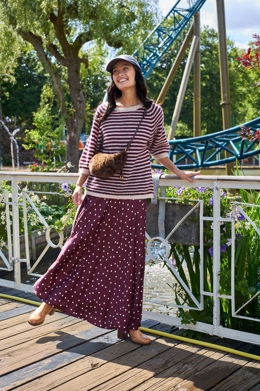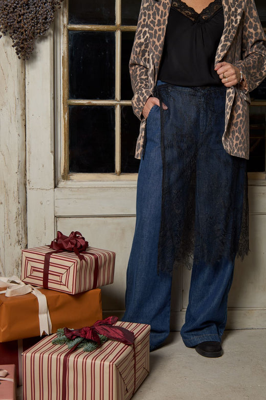 En lång spetskjol i midi- eller vadlängd är mångsidig och passar för olika tillfällen. Du kan styla den både uppklätt med en silkesblus och klackar för en festlig känsla, eller mer avslappnat med en enkel topp och sandaler för en bohemisk vardagslook. Det detaljerade blommiga spetsmönstret som täcker hela ytan gör att kjolen blir ett statementplagg i sig själv.