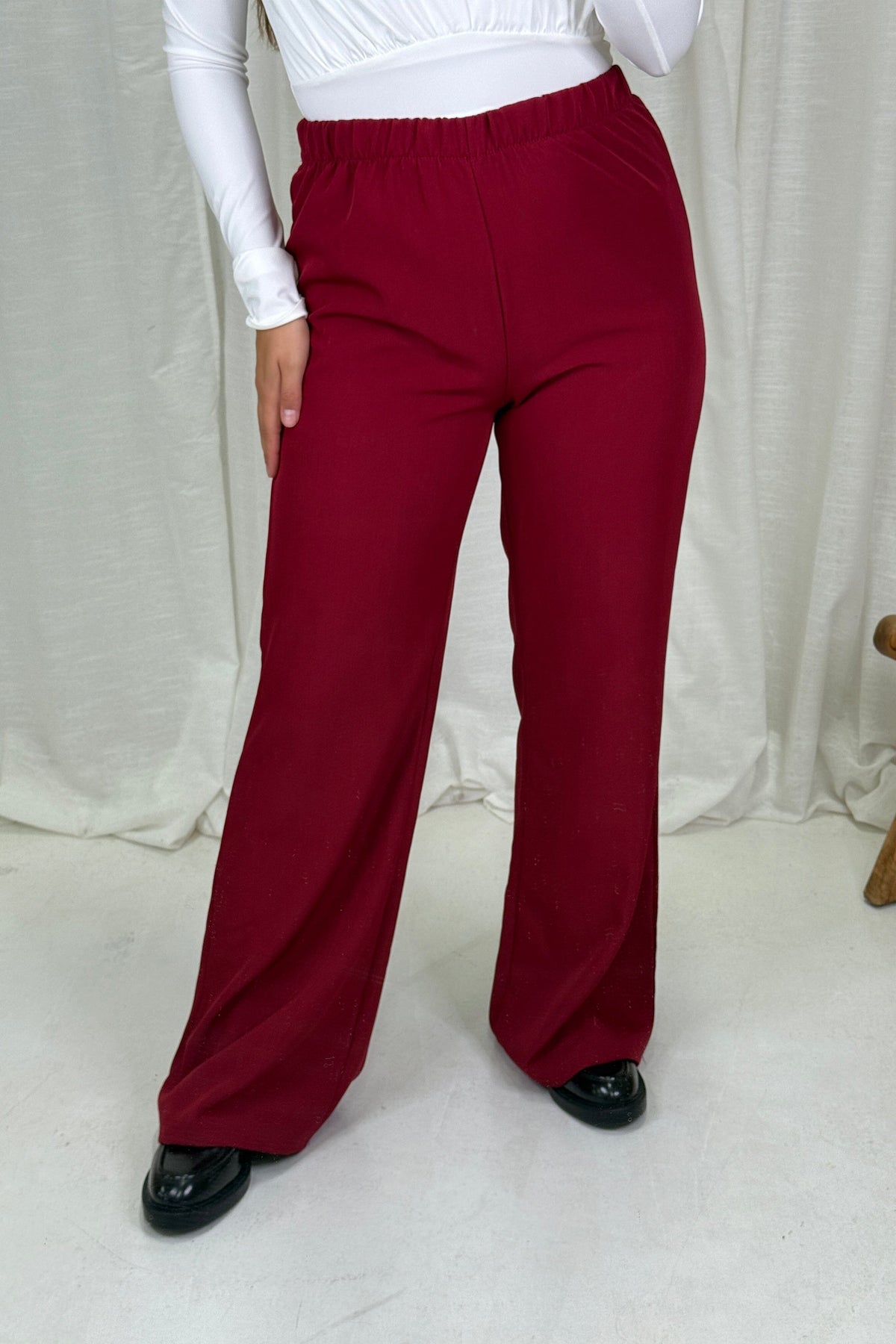 Bordeauxfärgade byxor från A-bee med hög midja och vida ben. Byxorna har en lös passform och går ända ner till golvet.