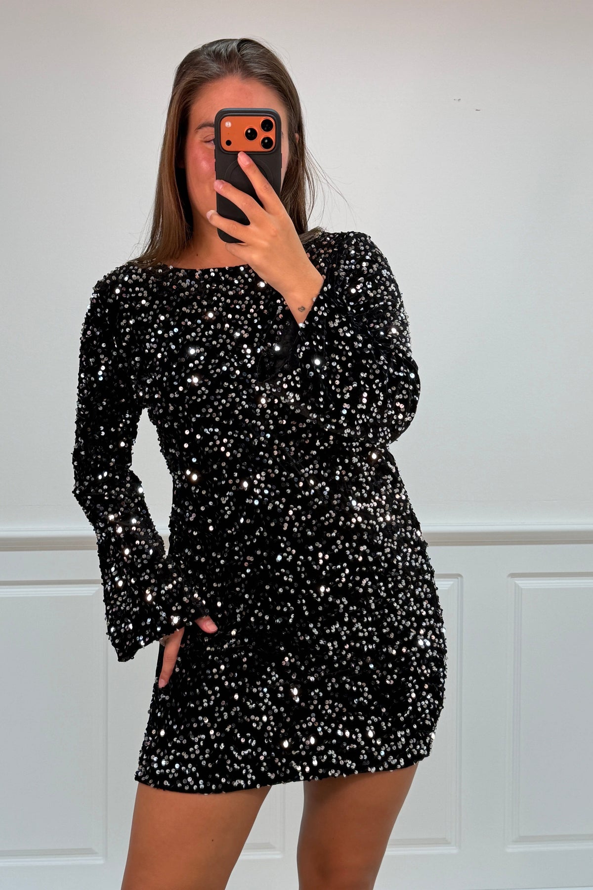 Festklänning från A-bee med glittrande paljetter och rosettdetaljer. Klänningen har en svart bas med silverfärgad mönster och långa ärmar. Den runda halsringningen och rosetten på ryggen ger klänningen en festlig prägel.