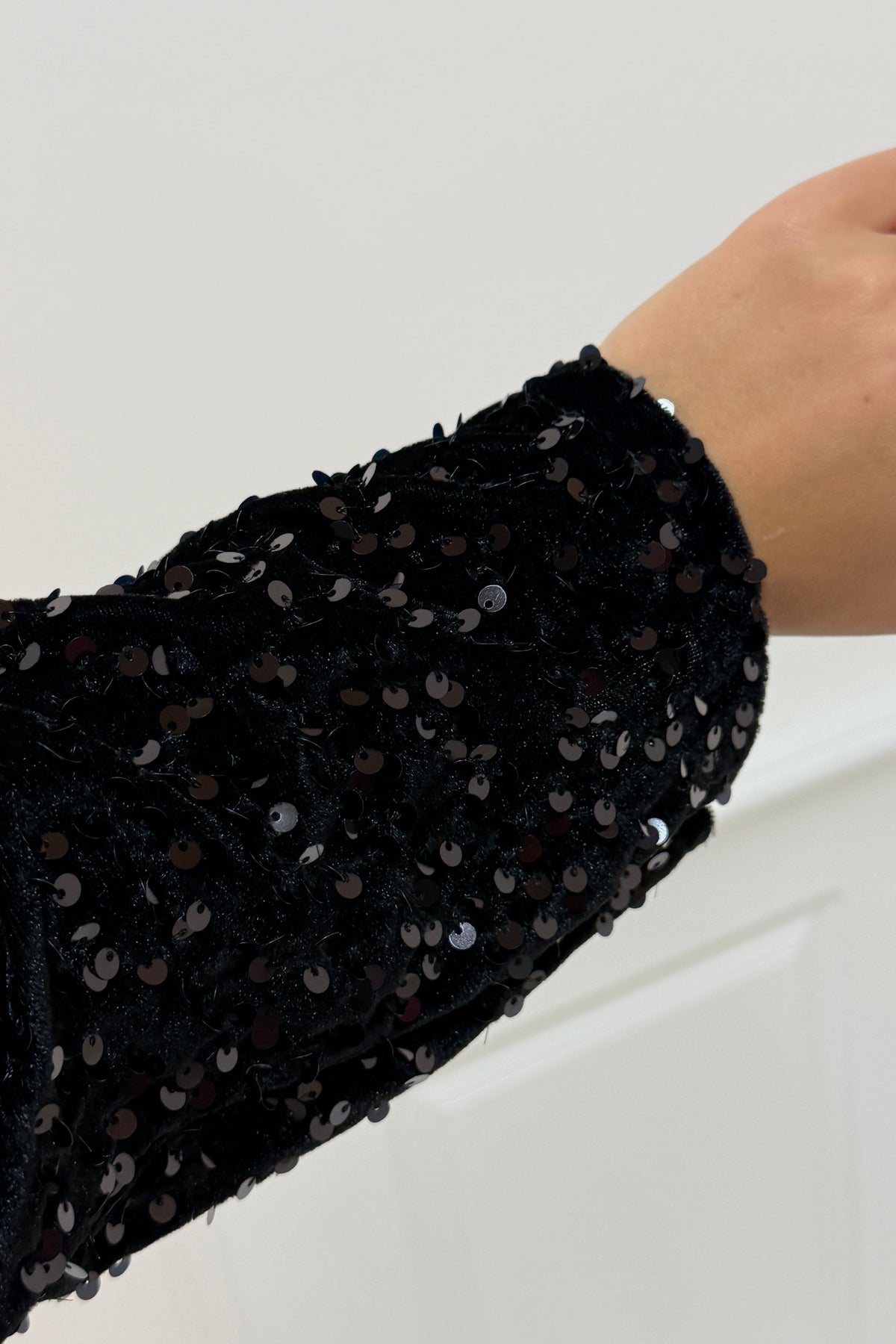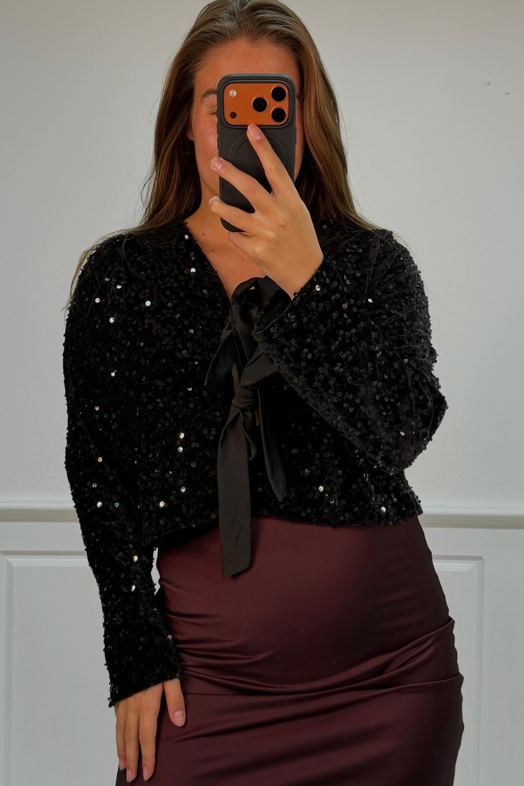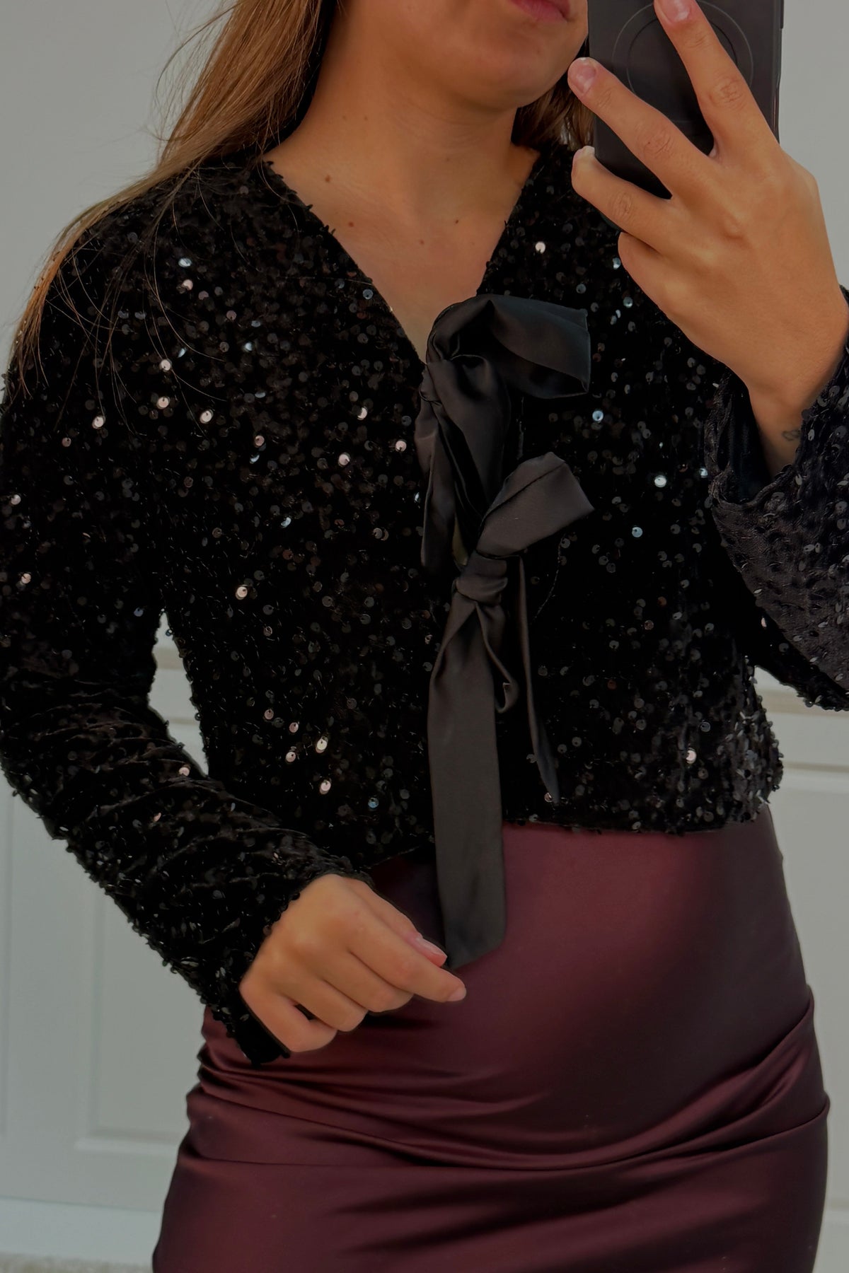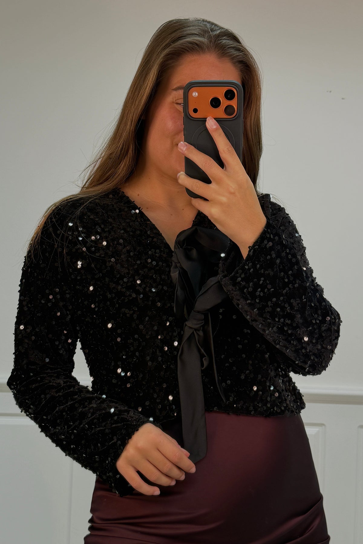 Svart blus från A-bee med paljetter och rosettdetaljer. Blusen har en V-ringning med snörstängning och långa ärmar. Den glittrande ytan och de dekorativa rosetterna gör den lämplig för festliga tillfällen.