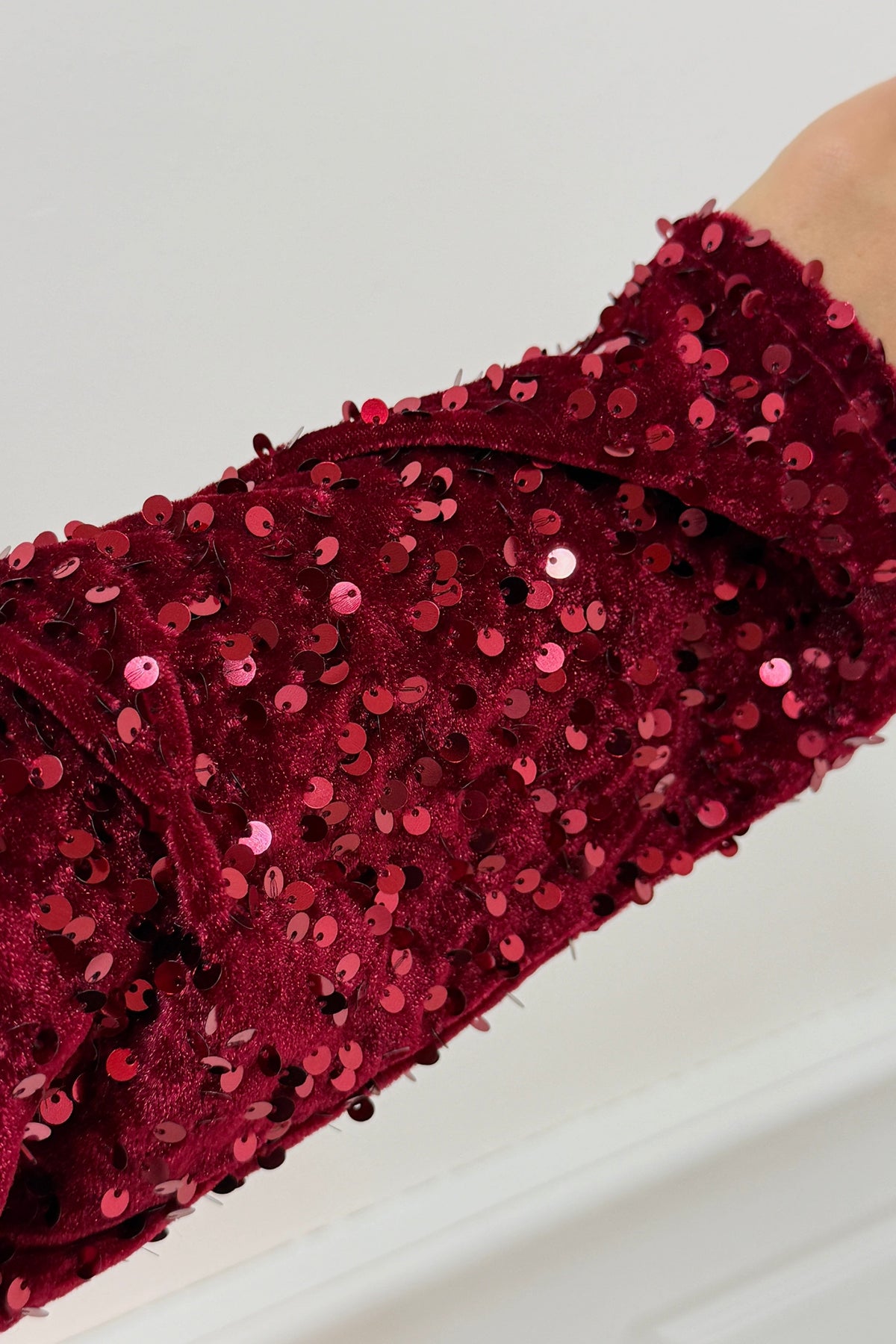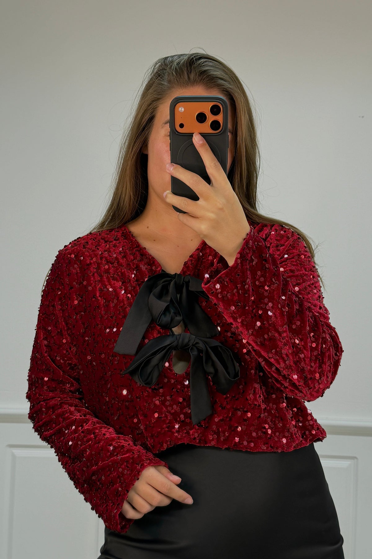 Bordeauxfärgad blus från A-bee med paljetter över hela. Den har långa ärmar, V-ringning och ett svart band vid halsen. Blusen stängs med snörning och har en vanlig passform.