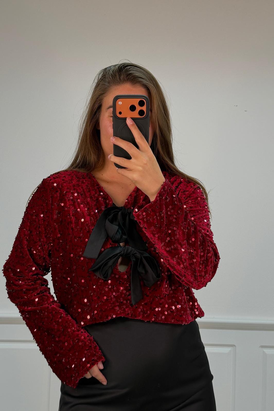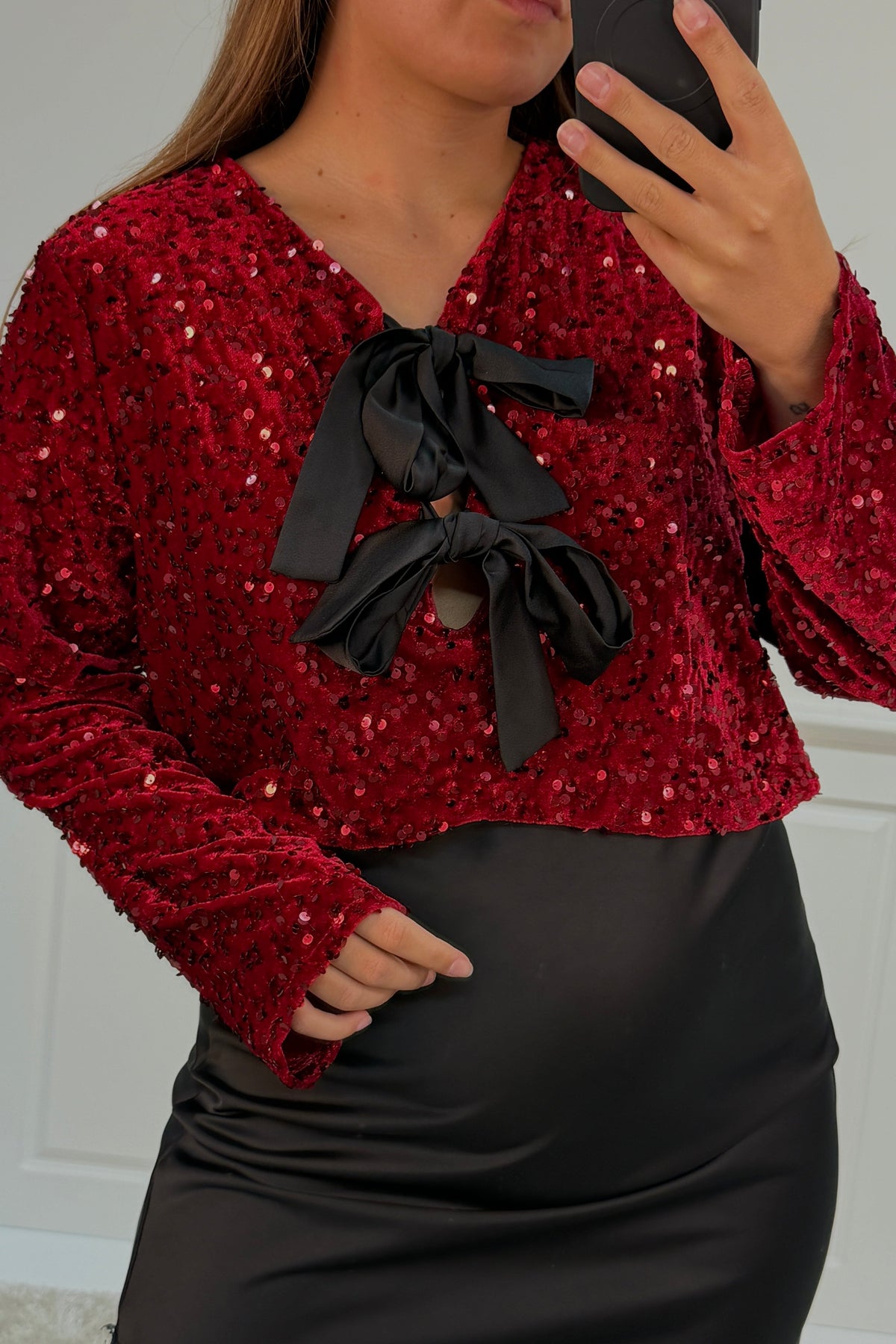 Bordeauxfärgad blus från A-bee med paljetter över hela. Den har långa ärmar, V-ringning och ett svart band vid halsen. Blusen stängs med snörning och har en vanlig passform.
