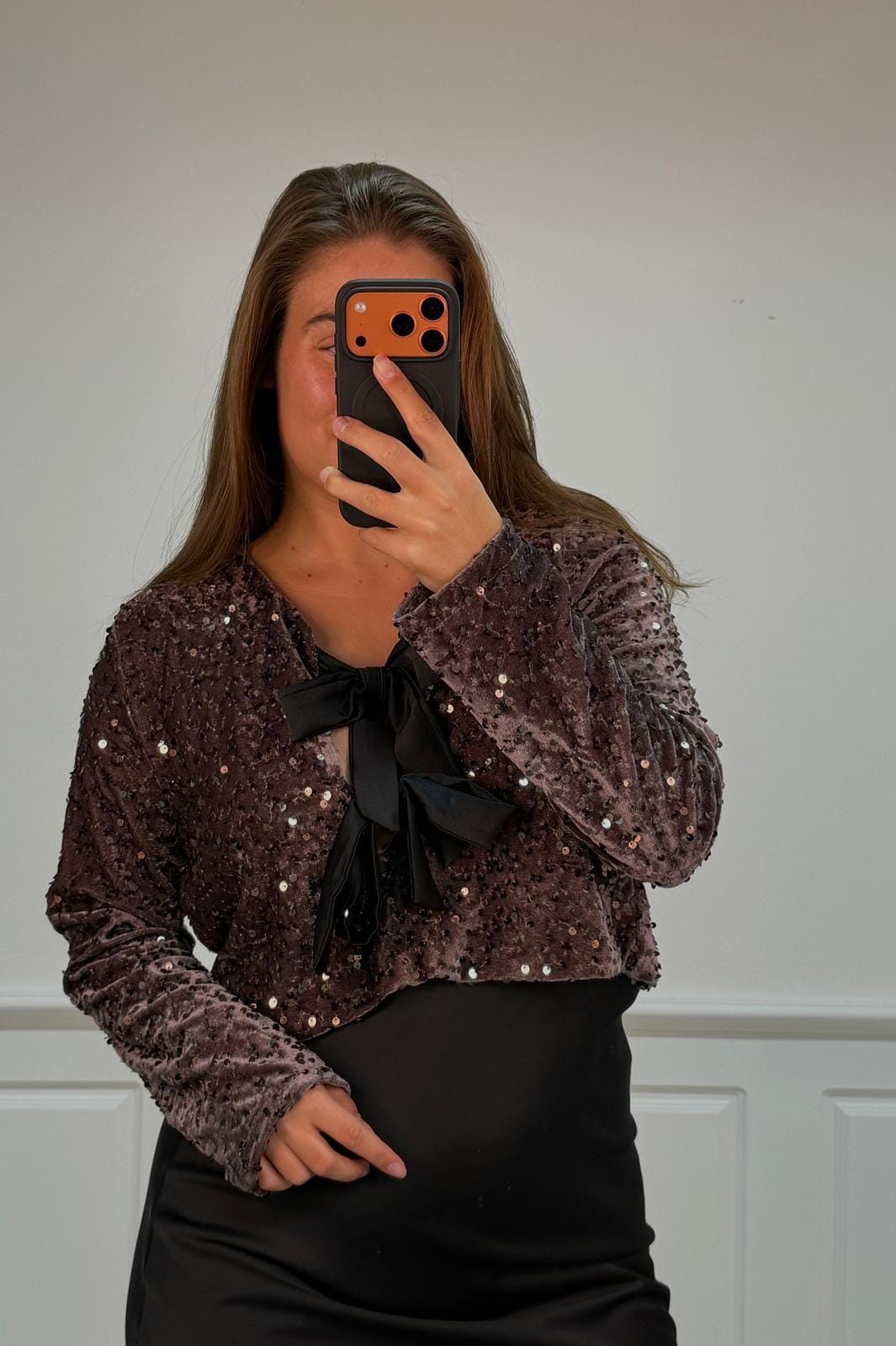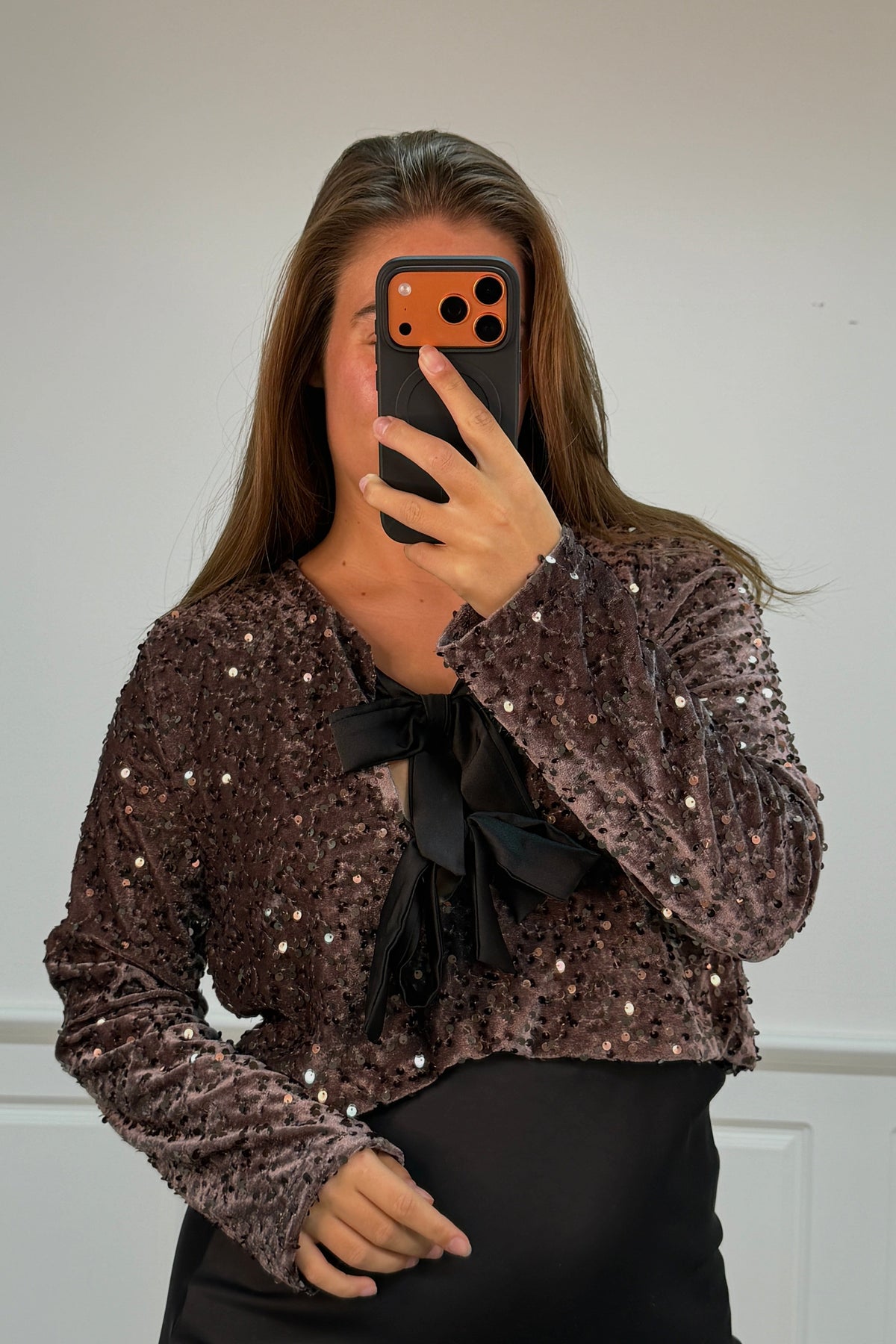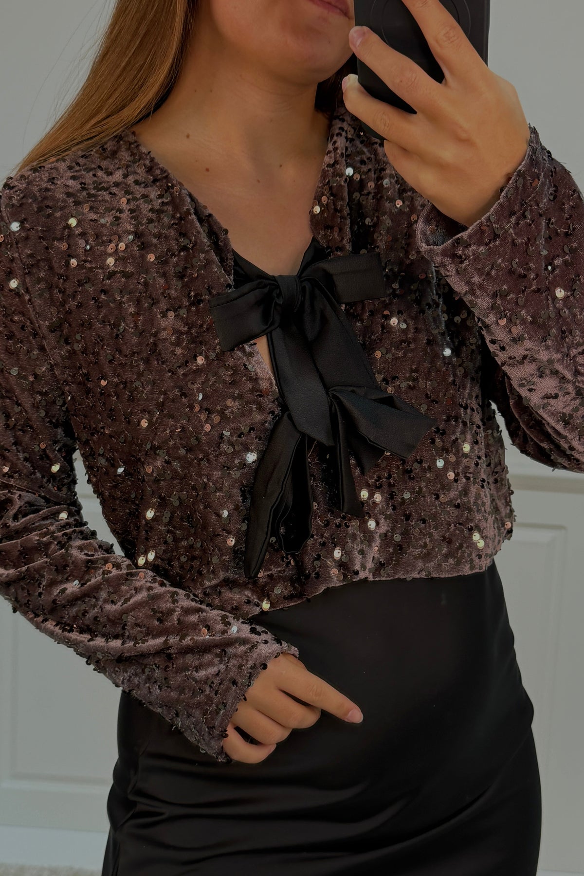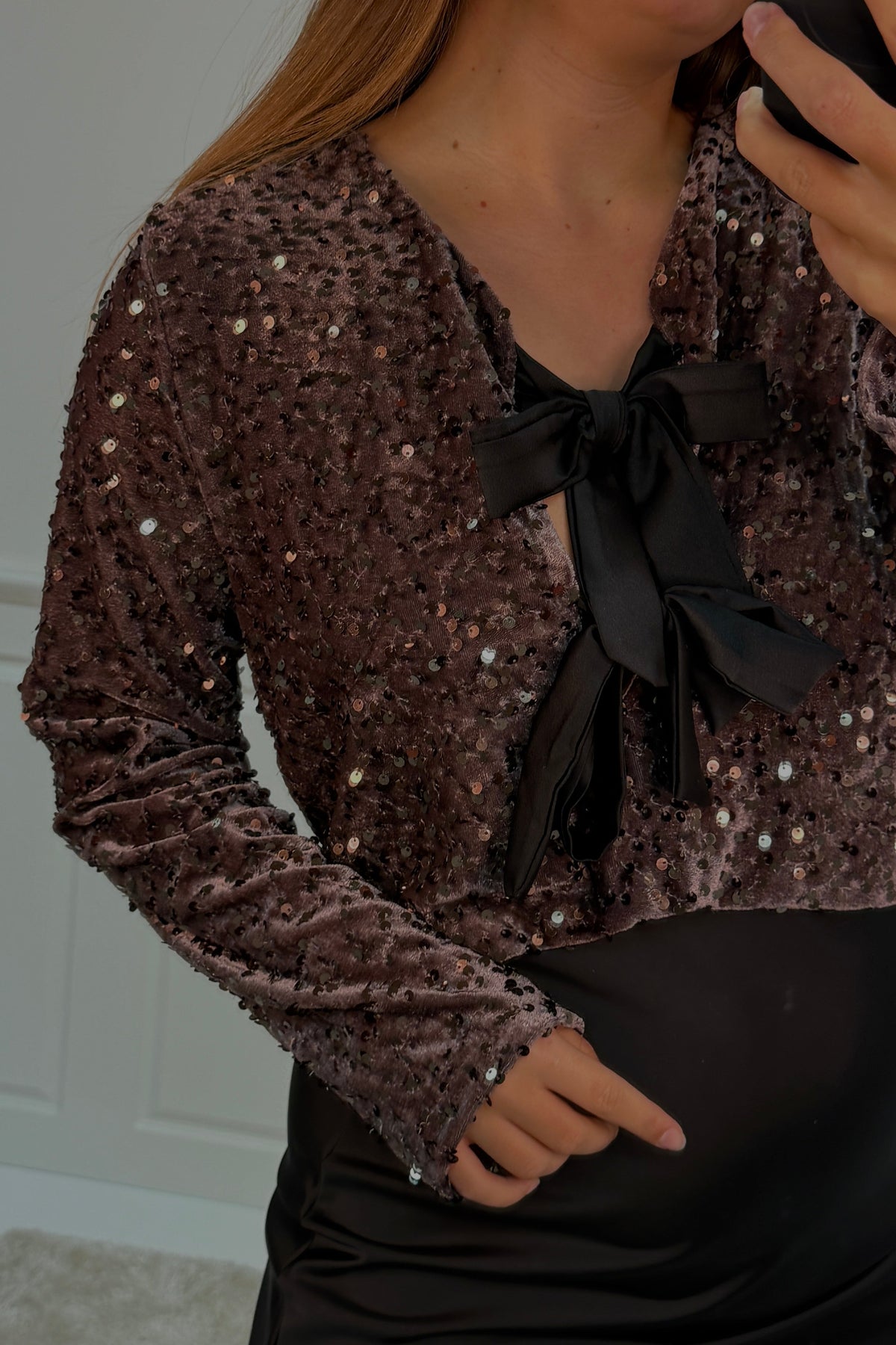 Festblus från A-bee i ljus maroon med paljetter över hela tyget. En V-ringning med svart rosett och långa ärmar ger blusen en festlig prägel.