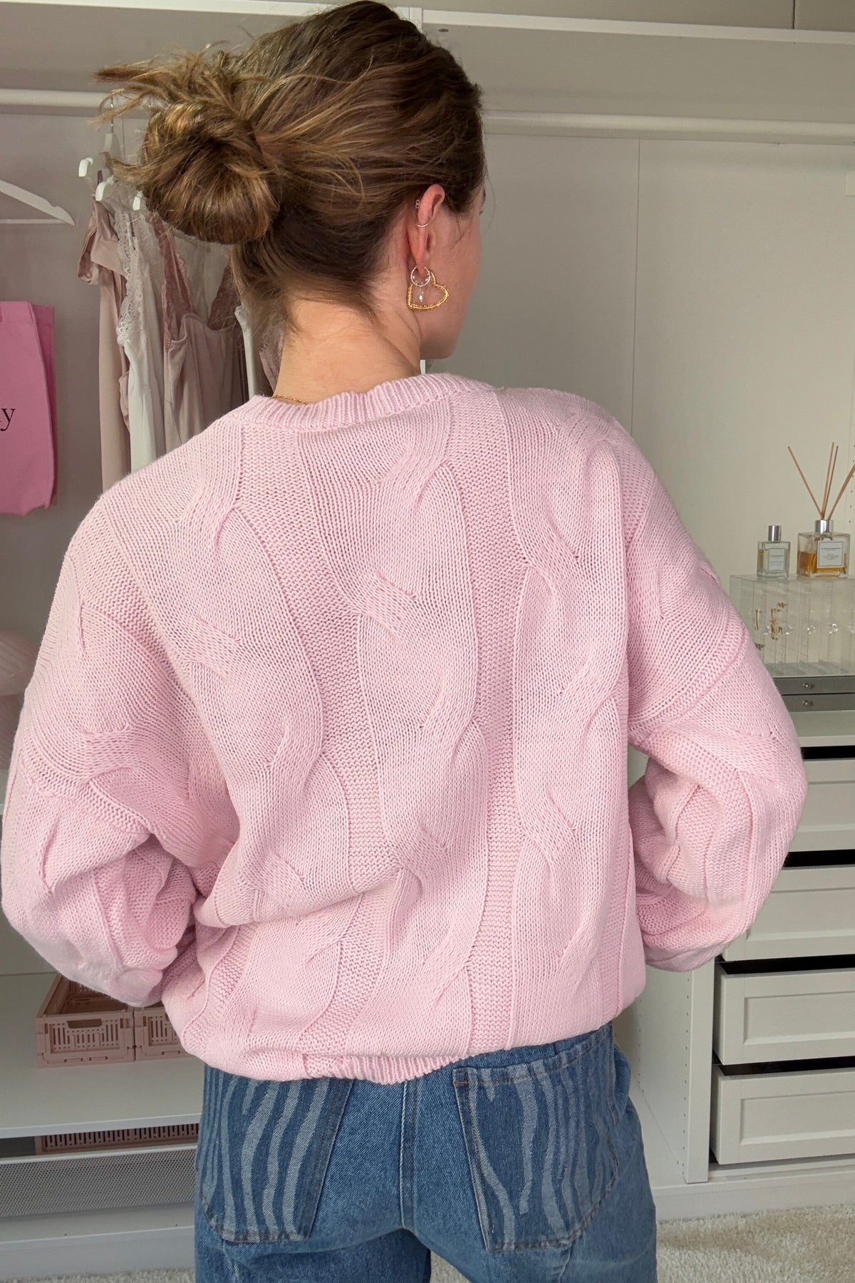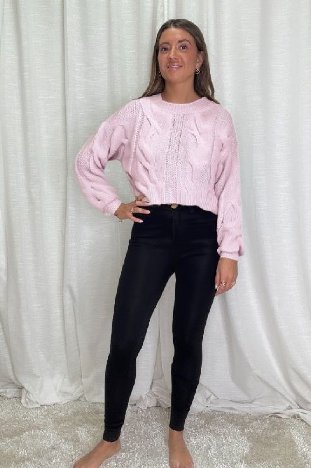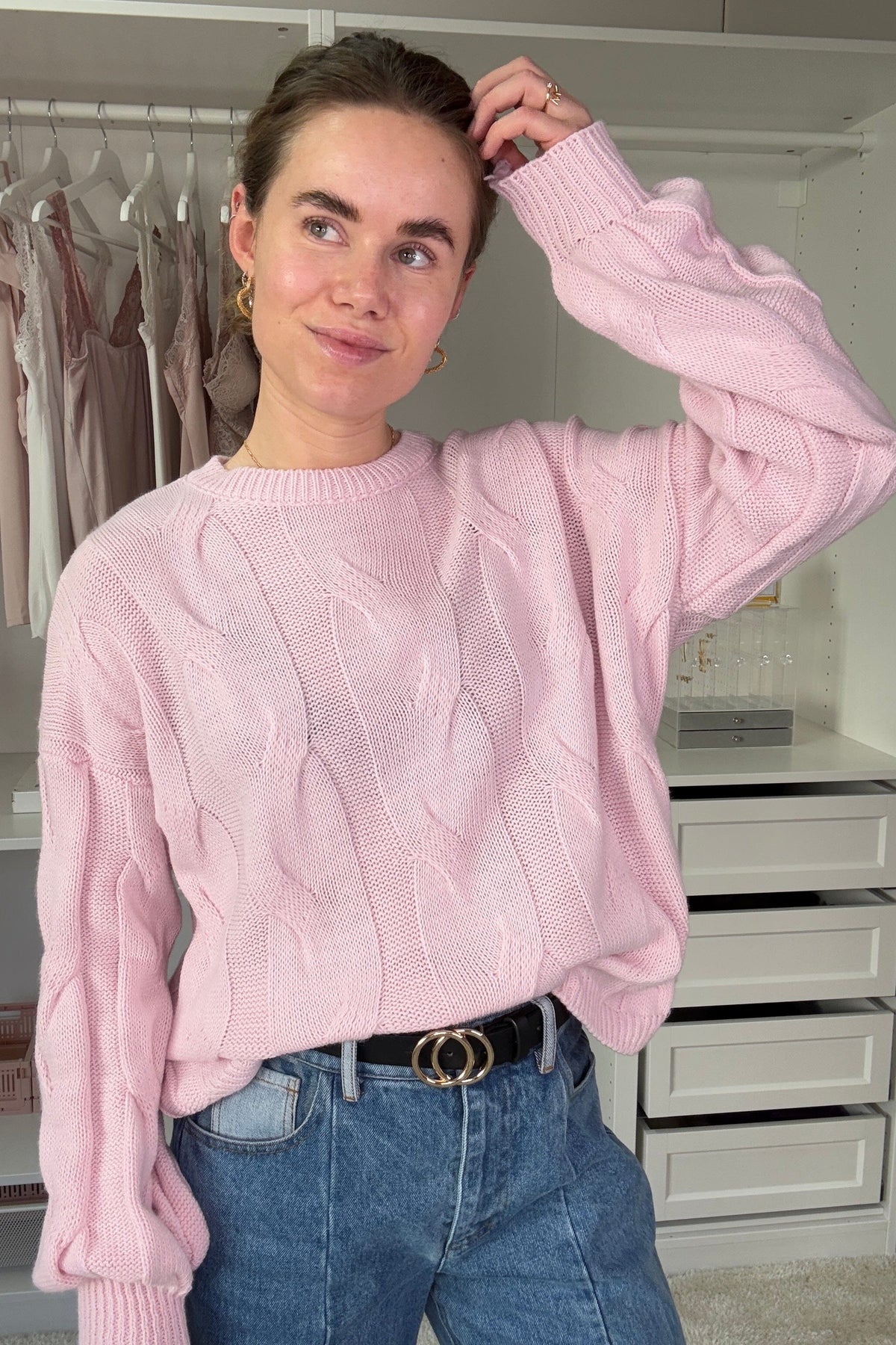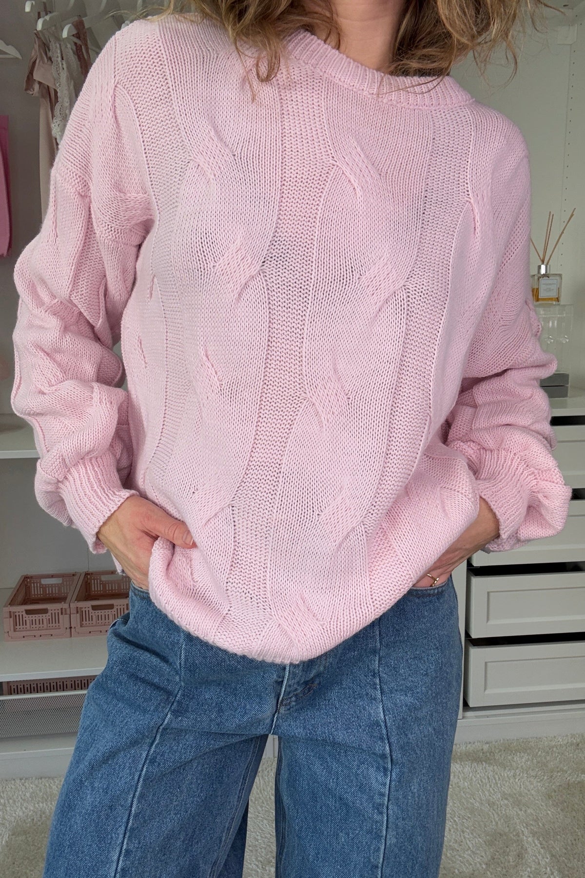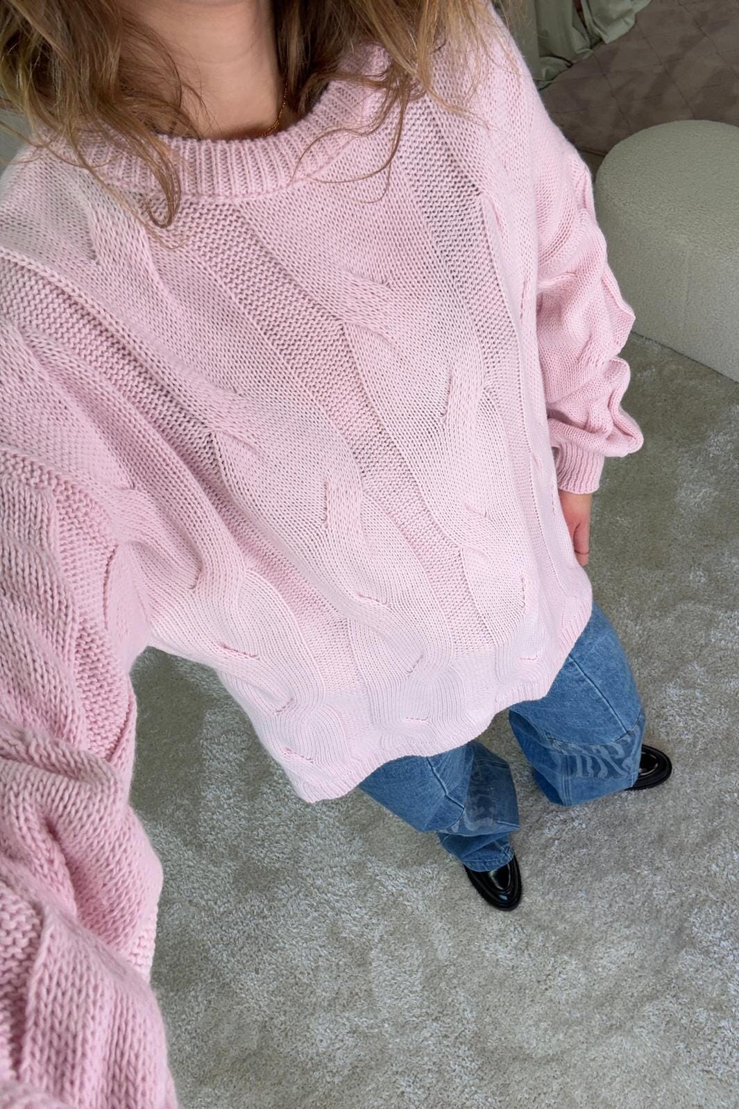 Rosa stickad tröja från A-bee med kabelstickning. Tröjan har en avslappnad passform med sänkta axlar och rund hals. Det mjuka garnet ger en bekväm och vardagsvänlig look.