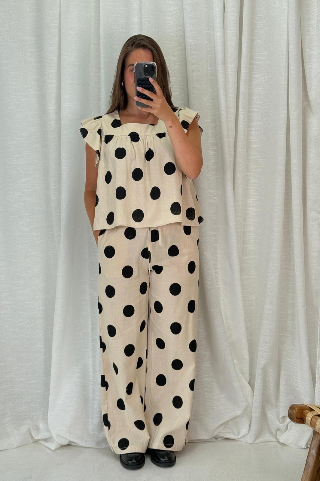 Byxor från A-bee, tillverkade av en blandning av bomull, viskos och linne i en ljus ecru-nyans. Dessa byxor har ett prickigt mönster med stora svarta prickar.