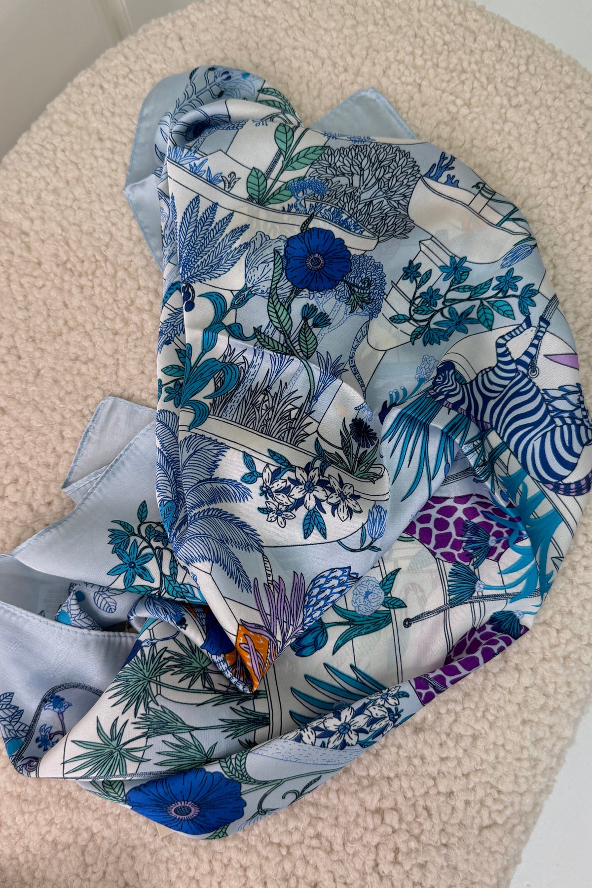 Blå scarf från A-bee med ett blommönster i blå, lila och gröna nyanser. Scarfen är gjord av en blandning av polyester och siden.