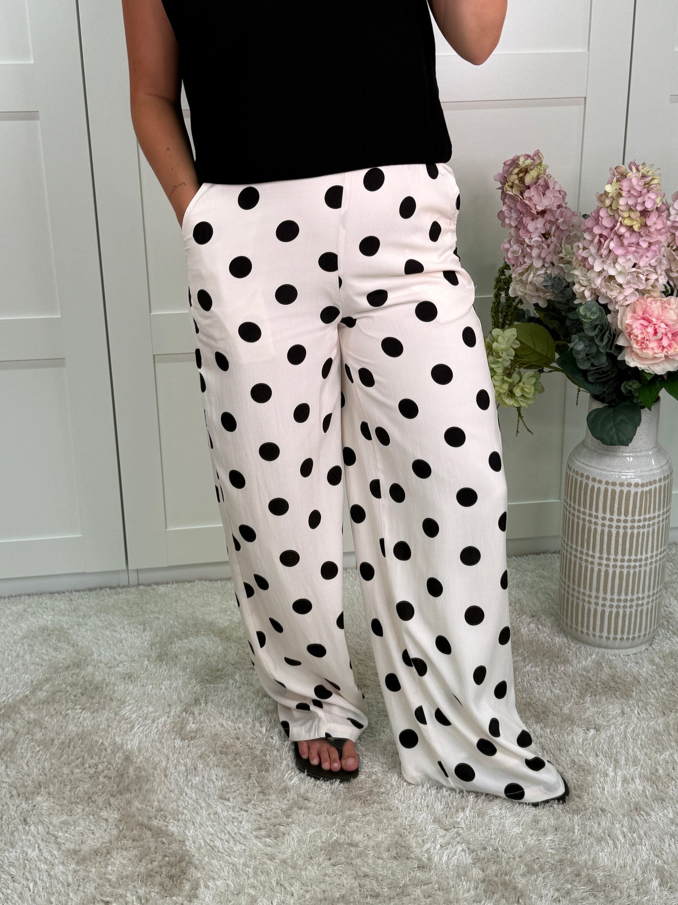 Vida byxor från A-bee i beige med svarta polkaprickar. Byxorna har en lös passform och går hela vägen ner till golvet.