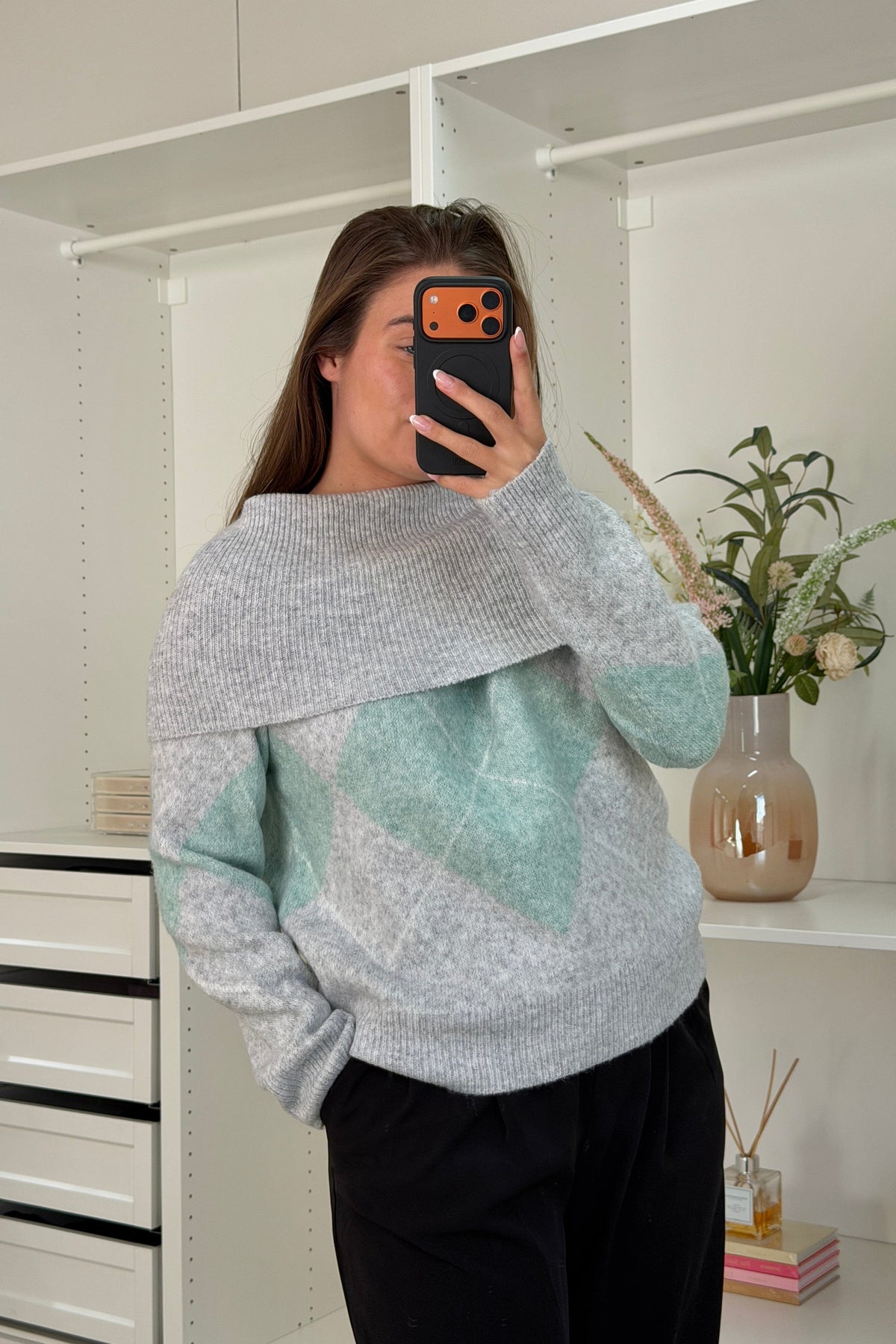 Stickad tröja från A-bee i en kombination av grått och grönt. Tröjan har ett rutigt diamantmönster med melerade detaljer.