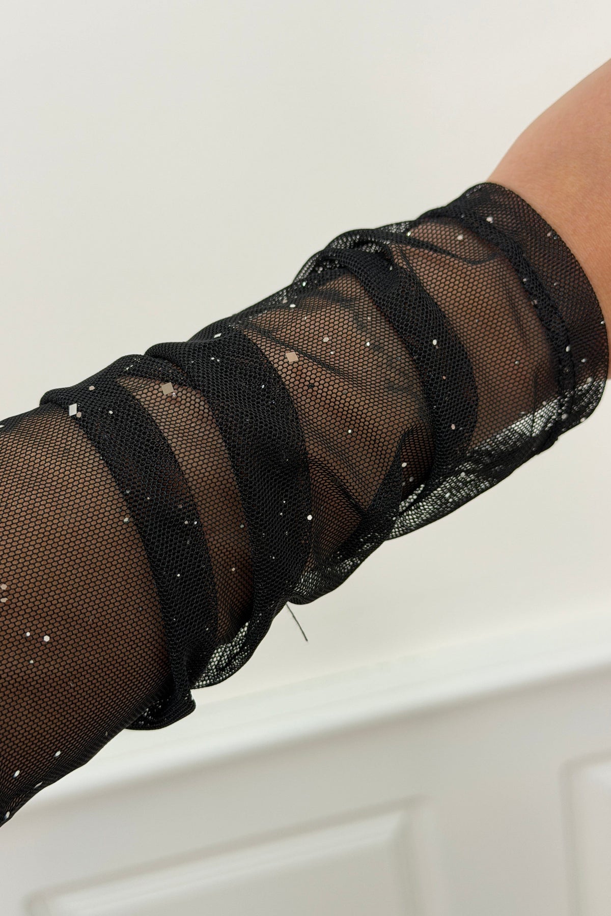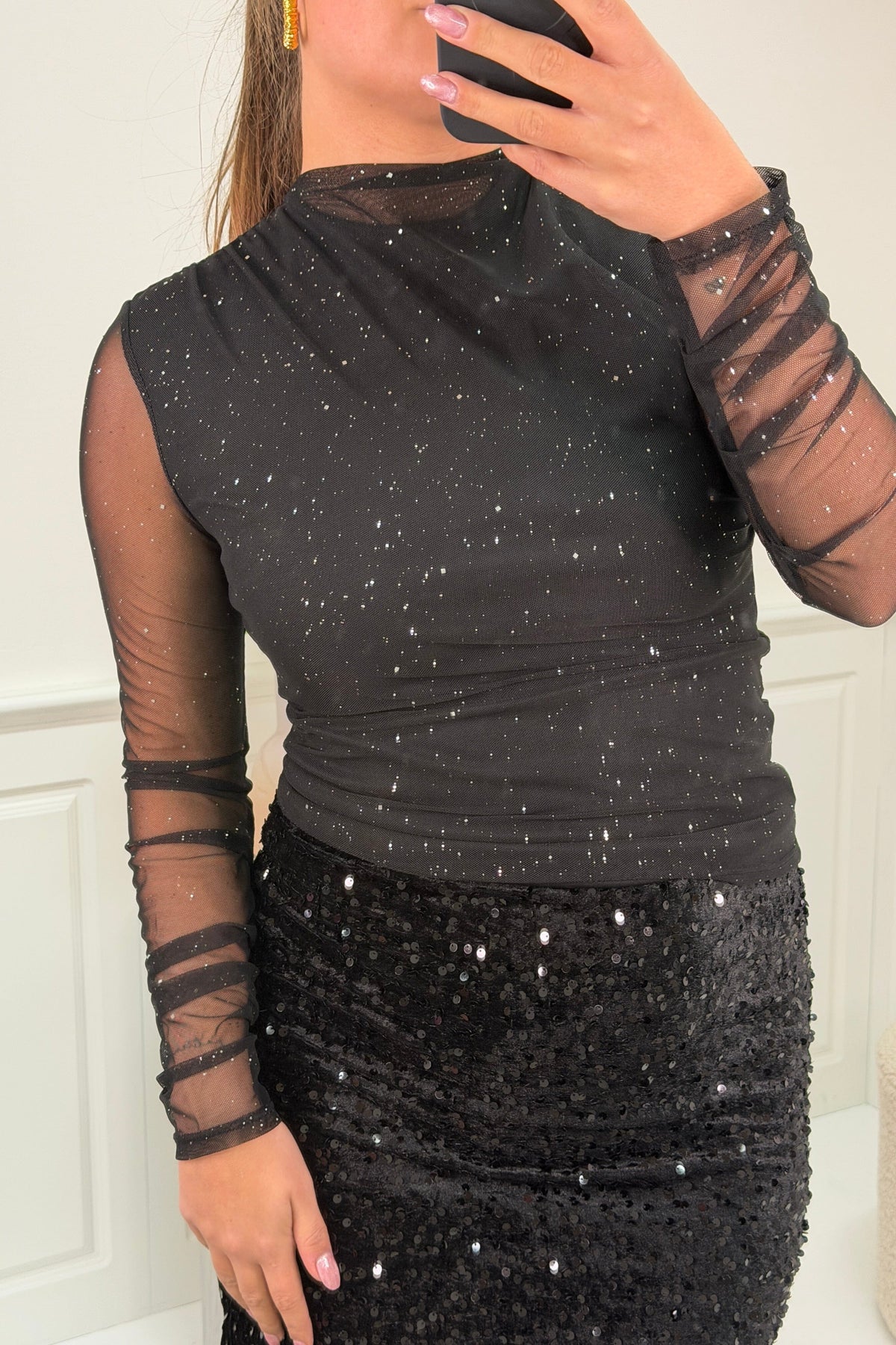 Svart blus från A-bee med paljetter på tyget. Blusen har genomskinliga meshärmar och en rynkad design som gör den lämplig för festliga tillfällen.
