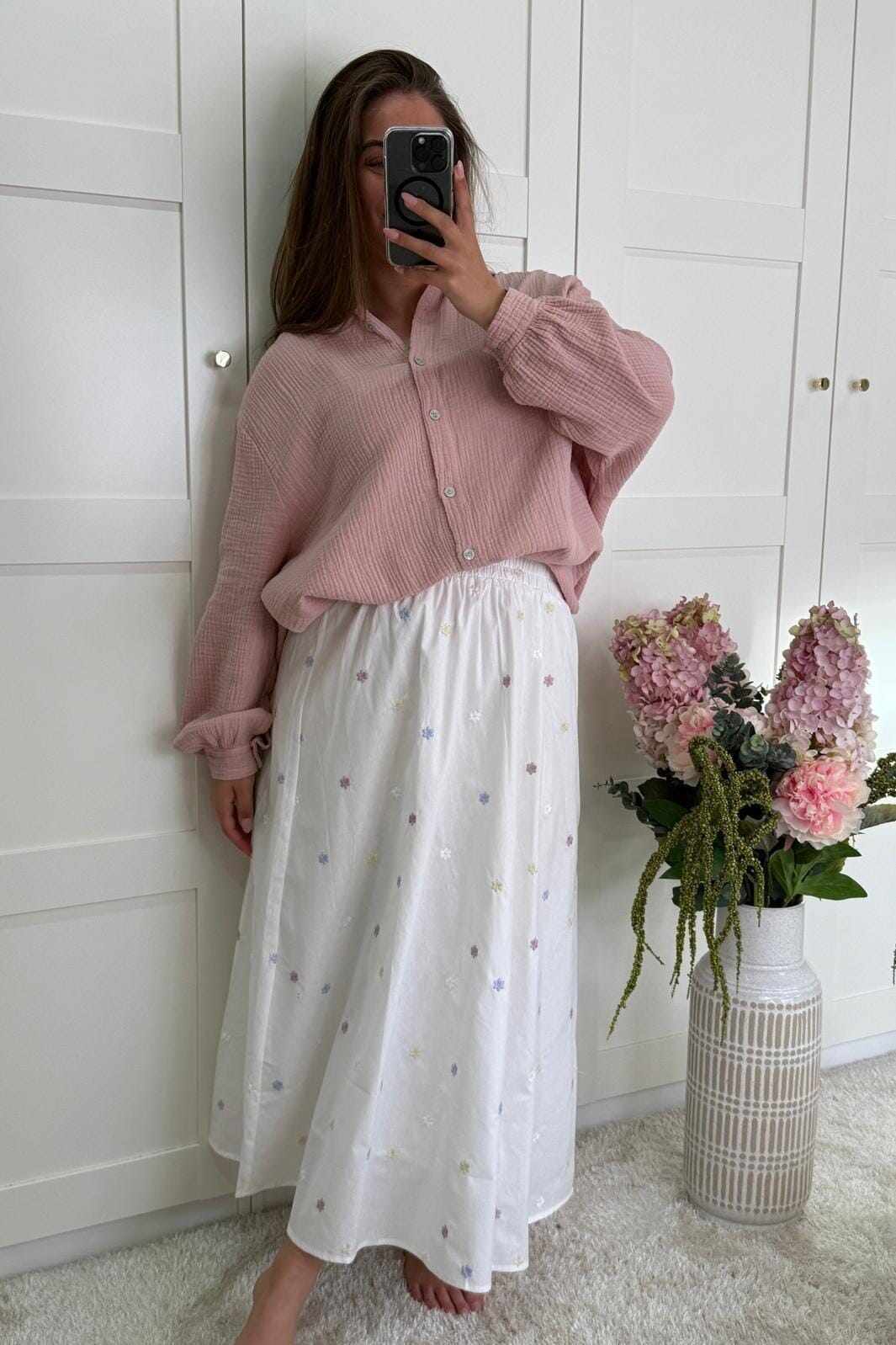 Vit kjol från A-bee med broderade blommor i lila, gult och rosa. Den har en lös passform och knälängd som gör den användbar både till vardags och fest.