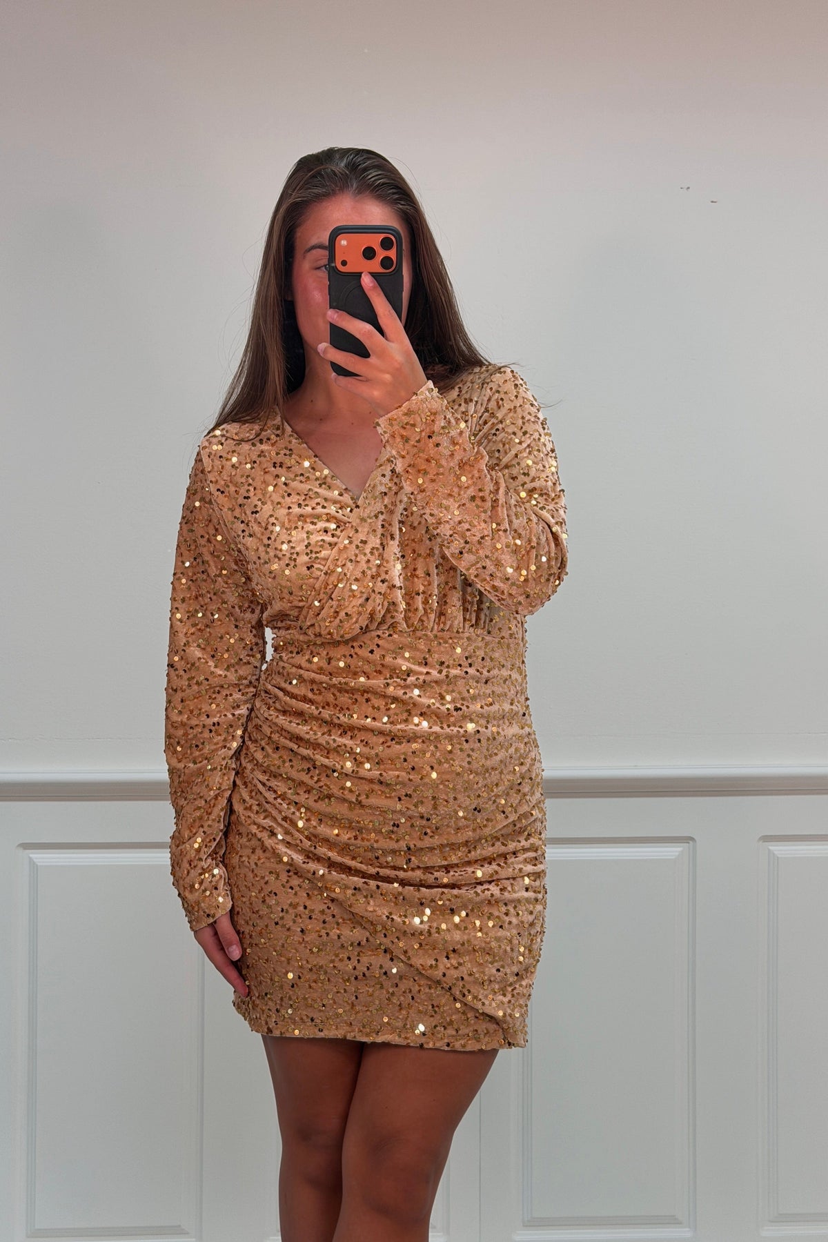 Guldklänning från A-bee, täckt av glittrande paljetter. Klänningen passar för festliga och formella tillfällen.