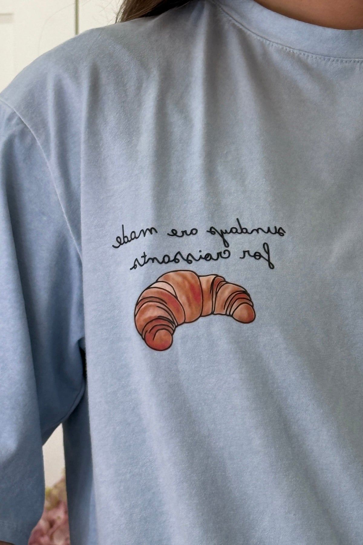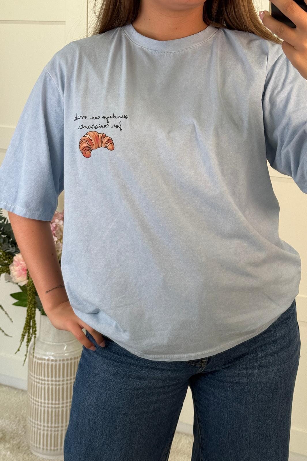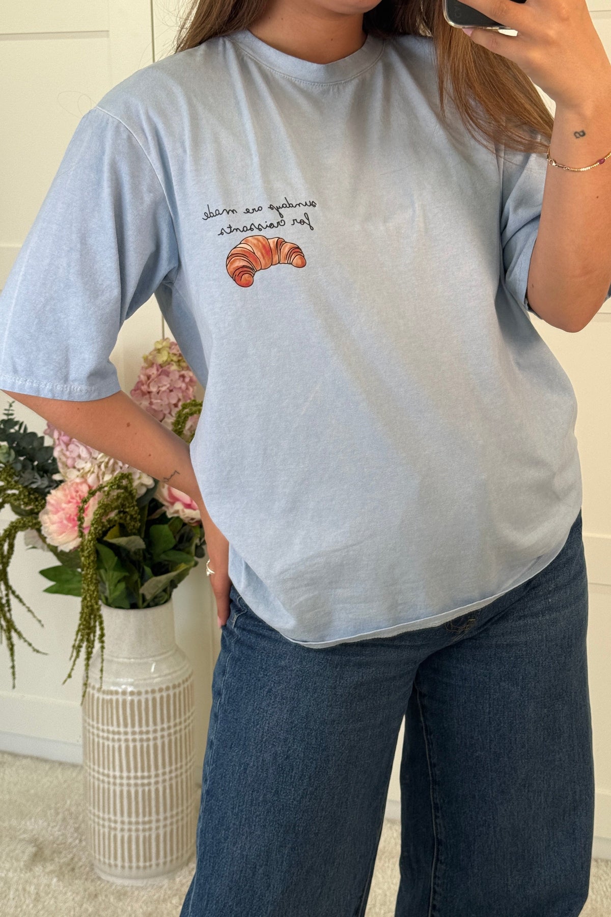 Ljusblå t-shirt från A-bee med en rolig croissant-illustration på vänster bröst. T-shirten har en rund halsringning och korta ärmar samt en bekväm passform.