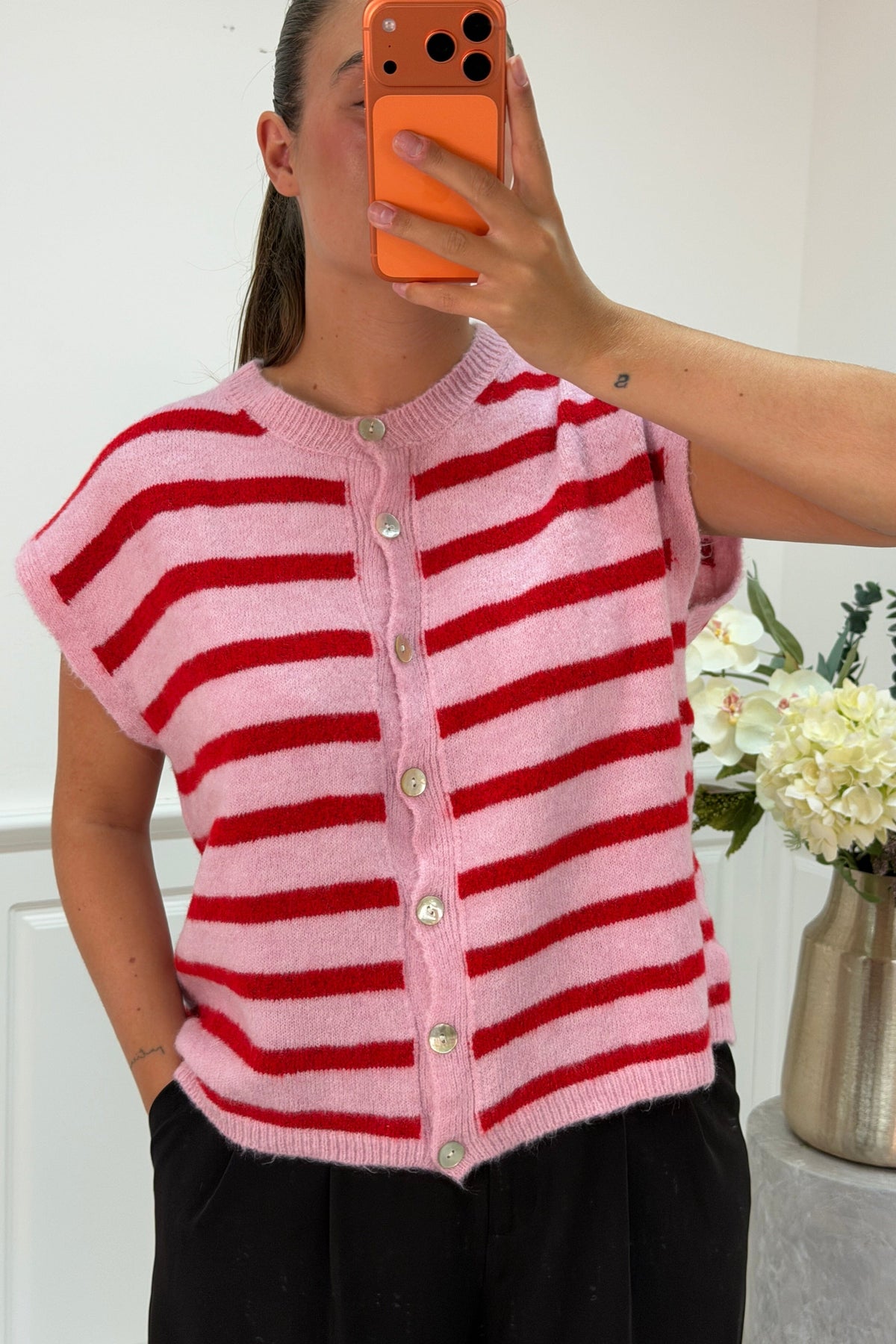 Randig väst från A-bee med röda och rosa horisontella ränder. Väst med pärldetaljer och knäppning framtill.