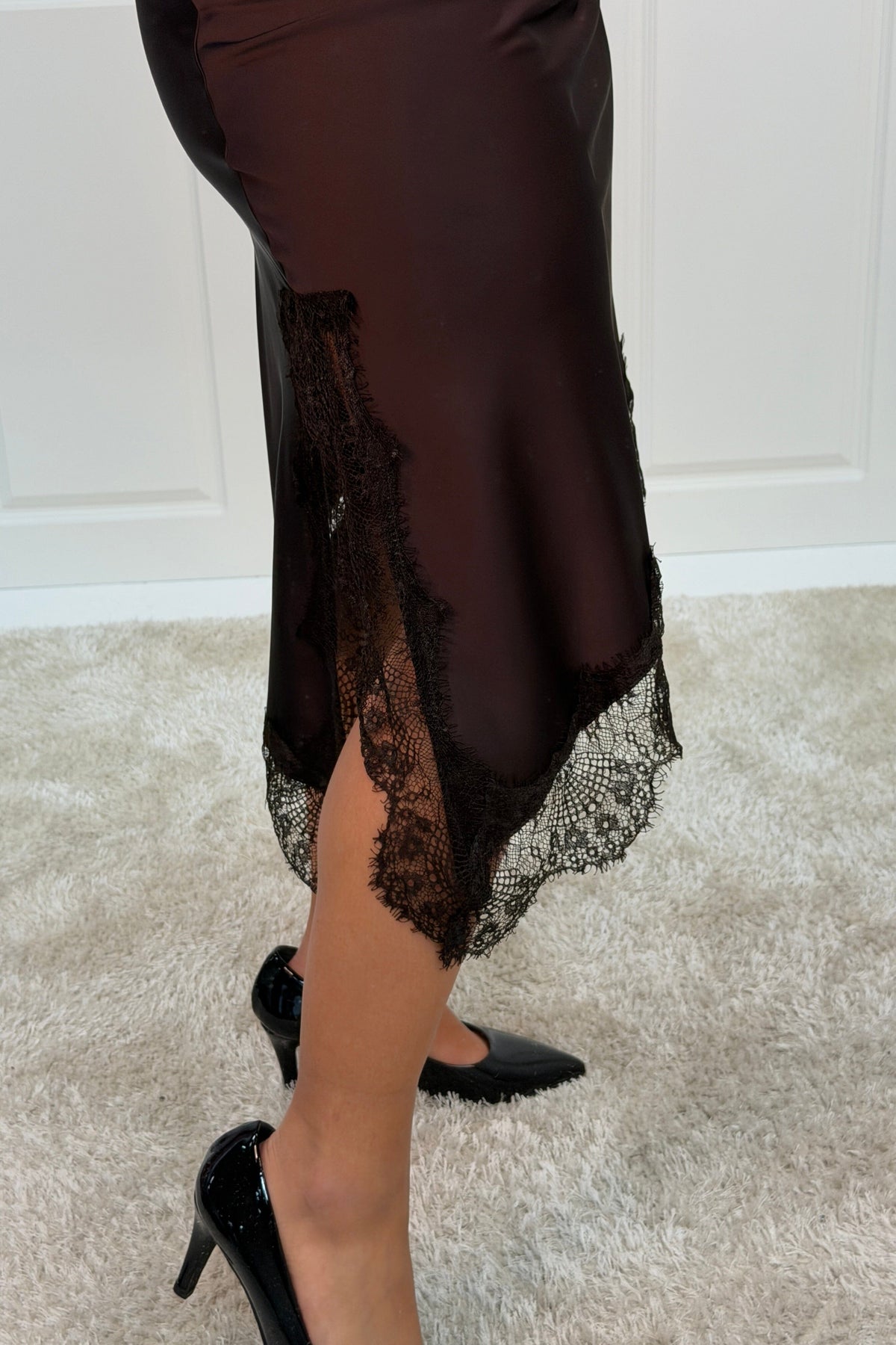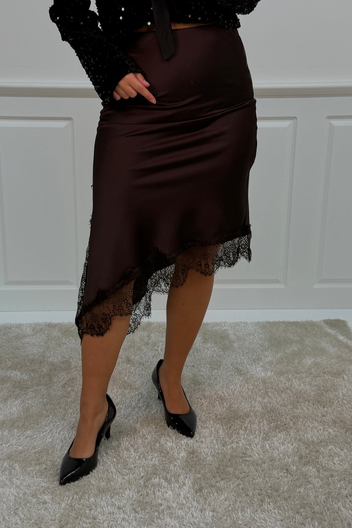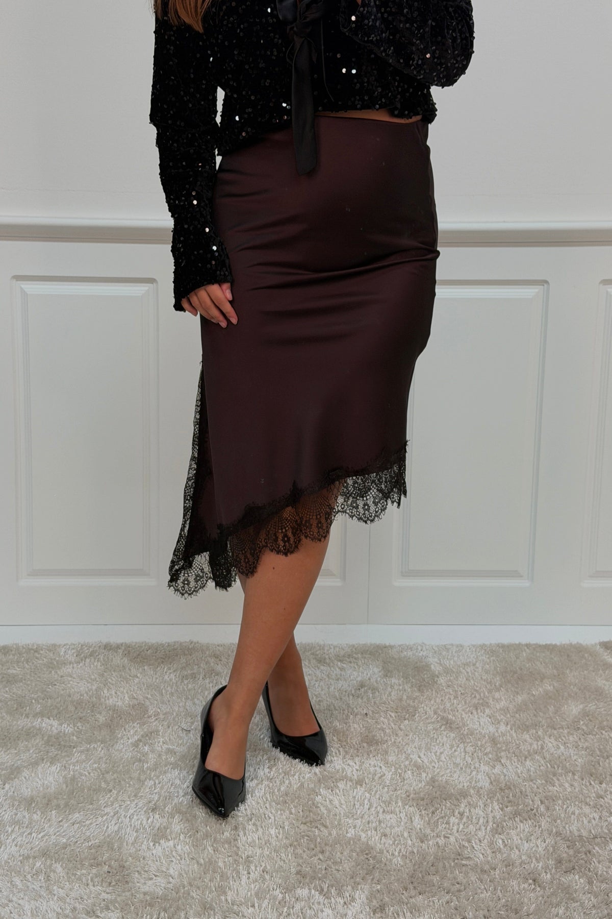 Brun kjol från A-bee med spetsdetaljer längs kanten. Kjolen är gjord av viskos och har en längd till vaden med vanlig midjehöjd.