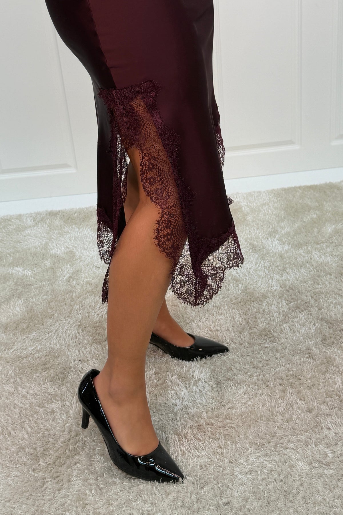 Plommonfärgad kjol från A-bee med spetsdetaljer längs kanten. Kjolen har en längd till mitten av vaden och en slät yta med glänsande finish.