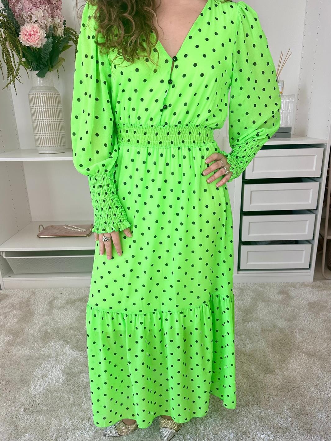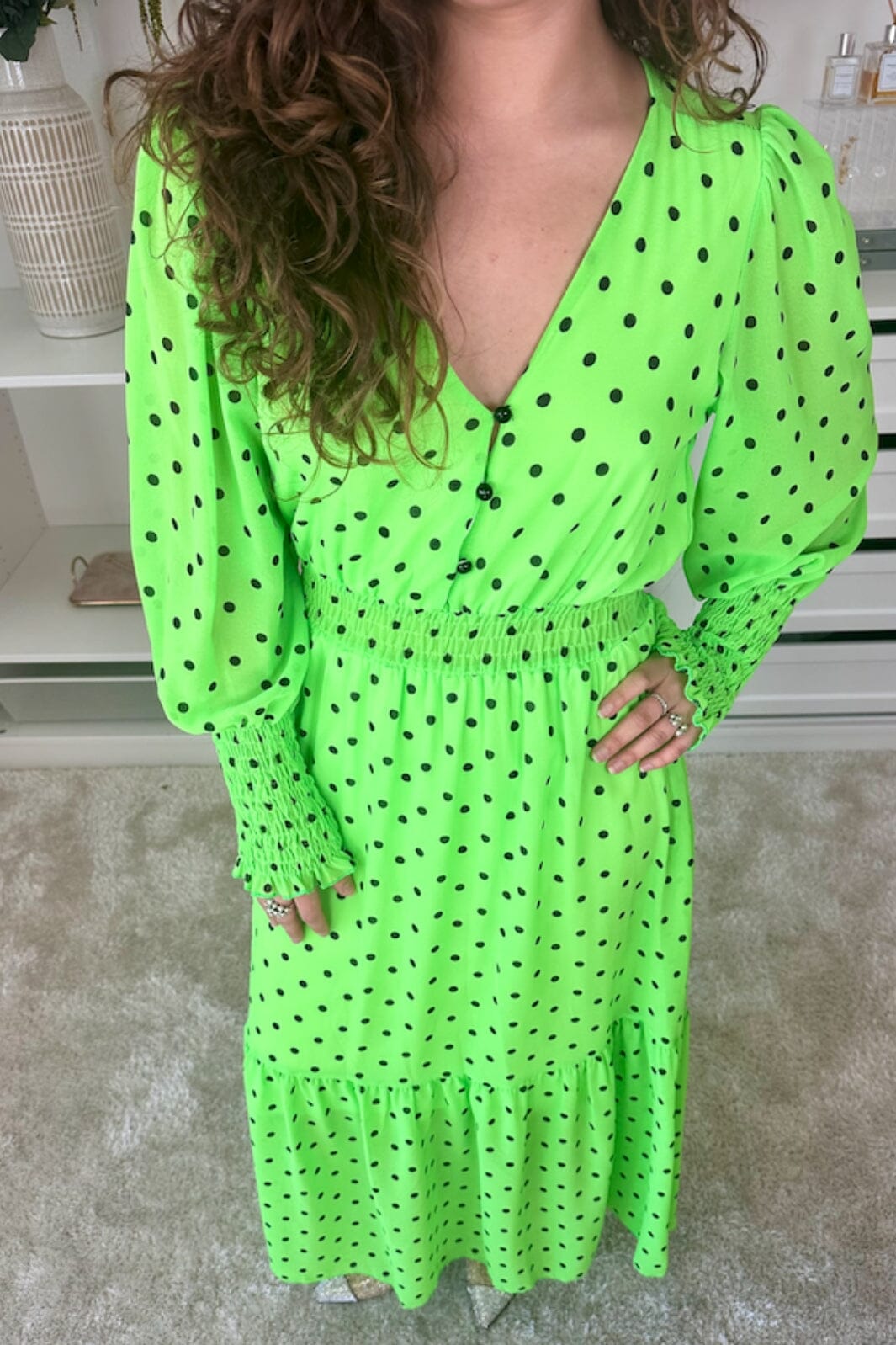Klänning från A-bee i en klar grön färg med svarta prickar. Klänningen har en smockmidja, V-hals och långa ärmar med rynkade manschetter. Kjolen går till vristerna.