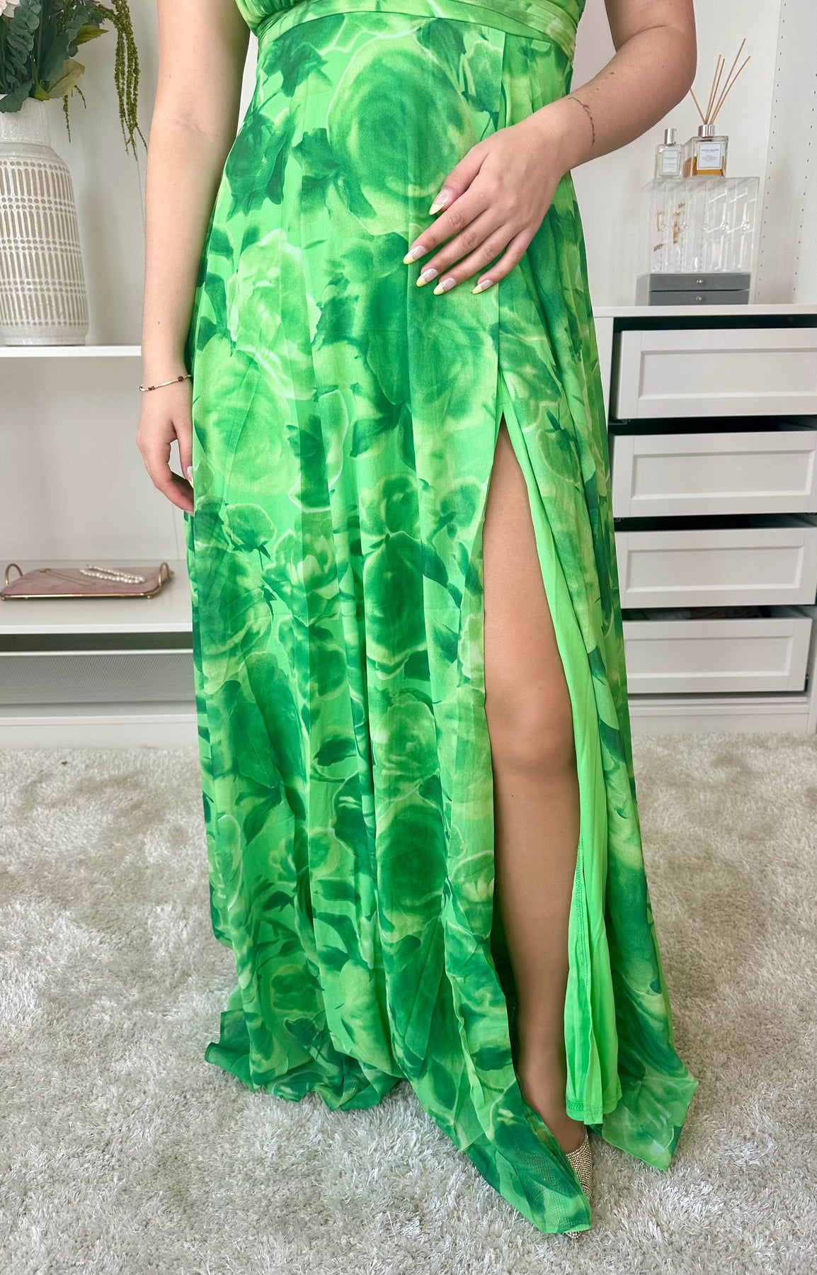 Lång klänning från A-bee i grön med blommönster. Klänningen har en off-shoulder-design med en stor blomsterdekoration på axeln och en hög slits på sidan.