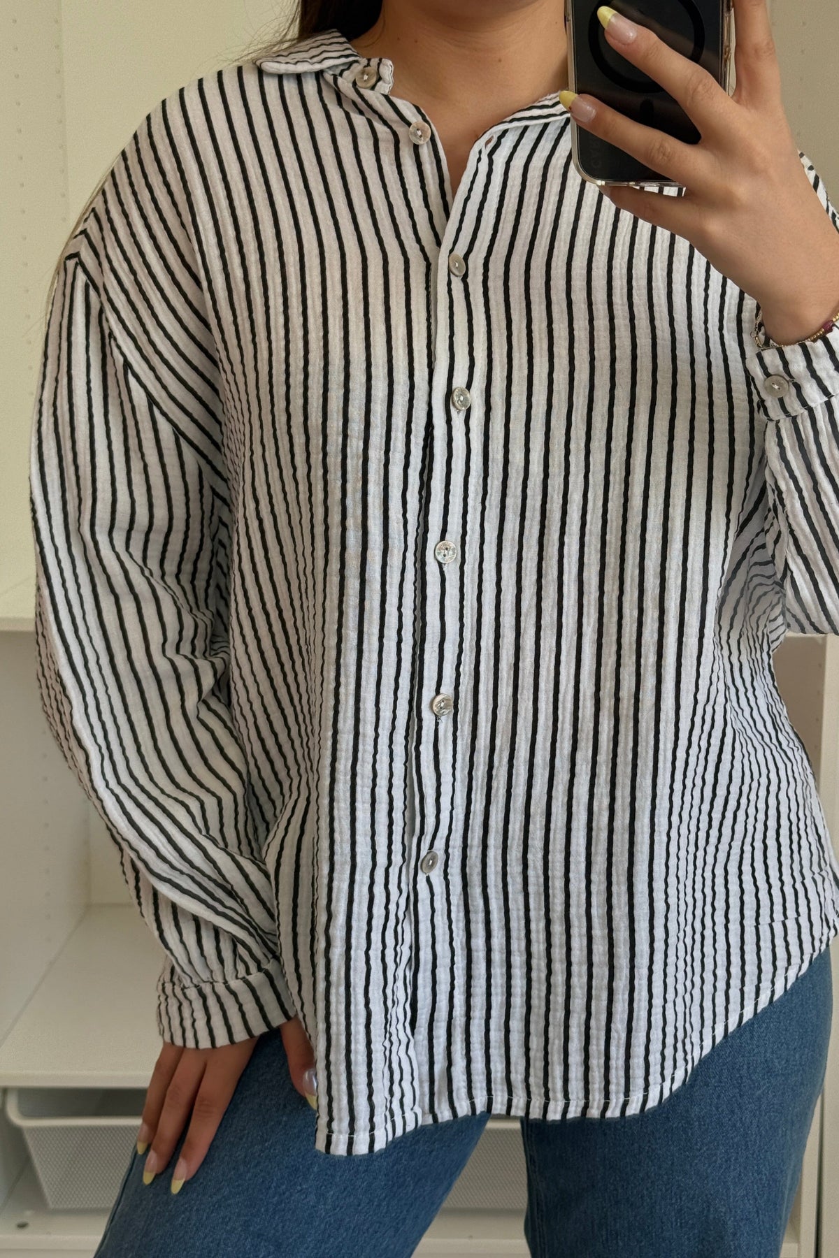 Vit och svart randig skjorta från A-bee med breda ärmar och skjortkrage. Skjortan har en knapplåsning fram och pärldetaljer på knapparna.