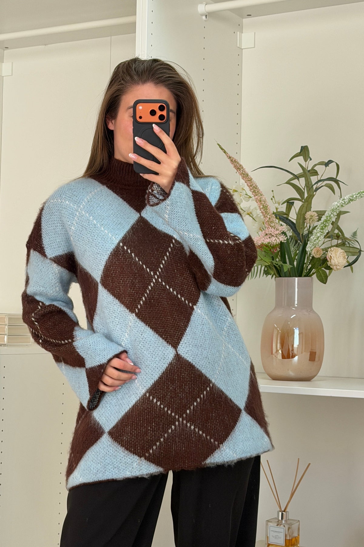 Stickad tröja från A-bee i ljusblått och brunt. Tröjan har ett argylemönster, hög krage och en lös passform.