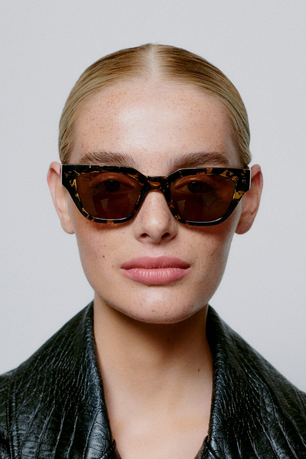 Rektangulära solglasögon från A. Kjærbede i svart och gul sköldpaddsmönster. Ramen har bruna tonade linser och är tillverkad av polykarbonat med formbara stänger för individuell anpassning.