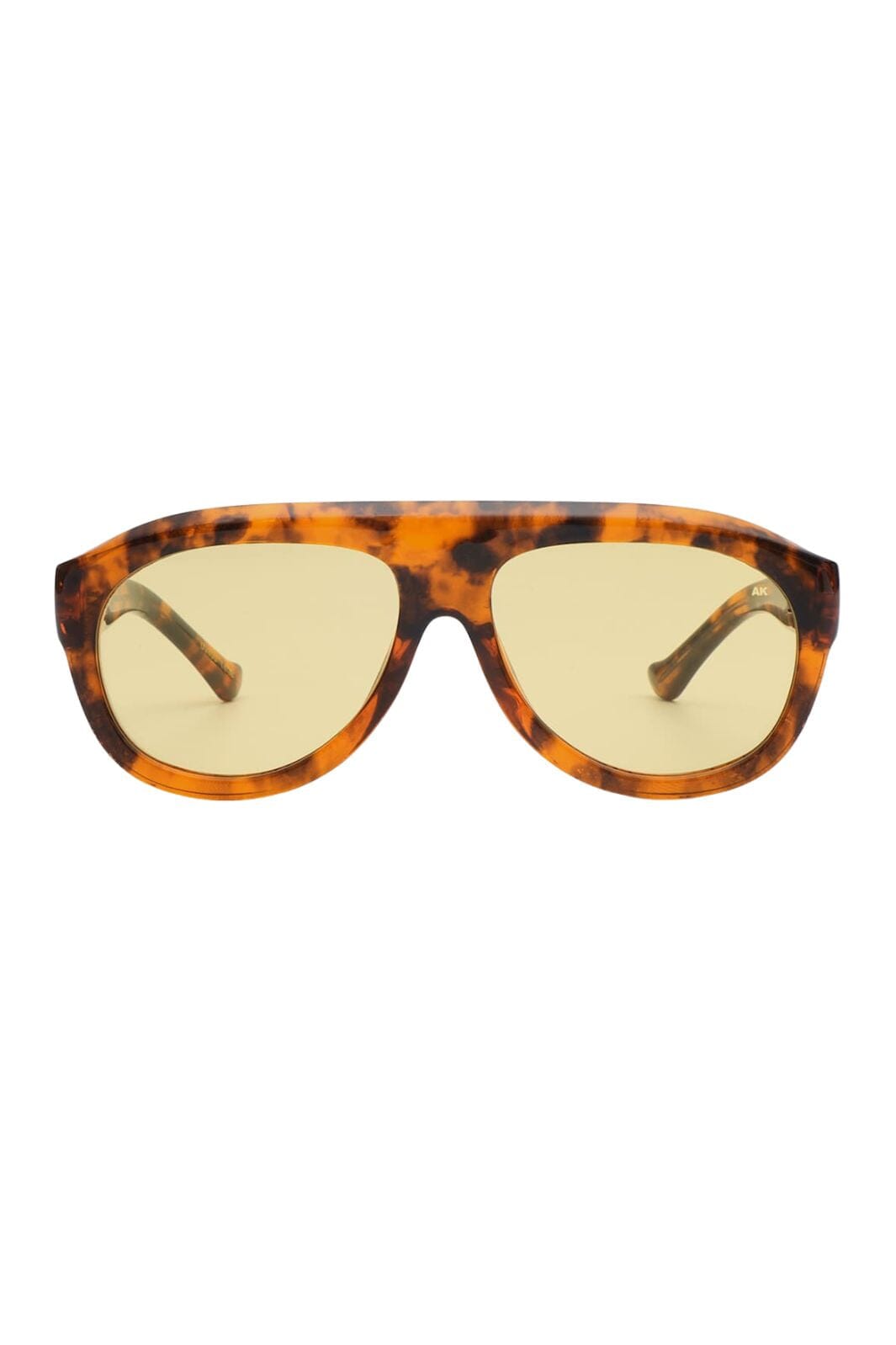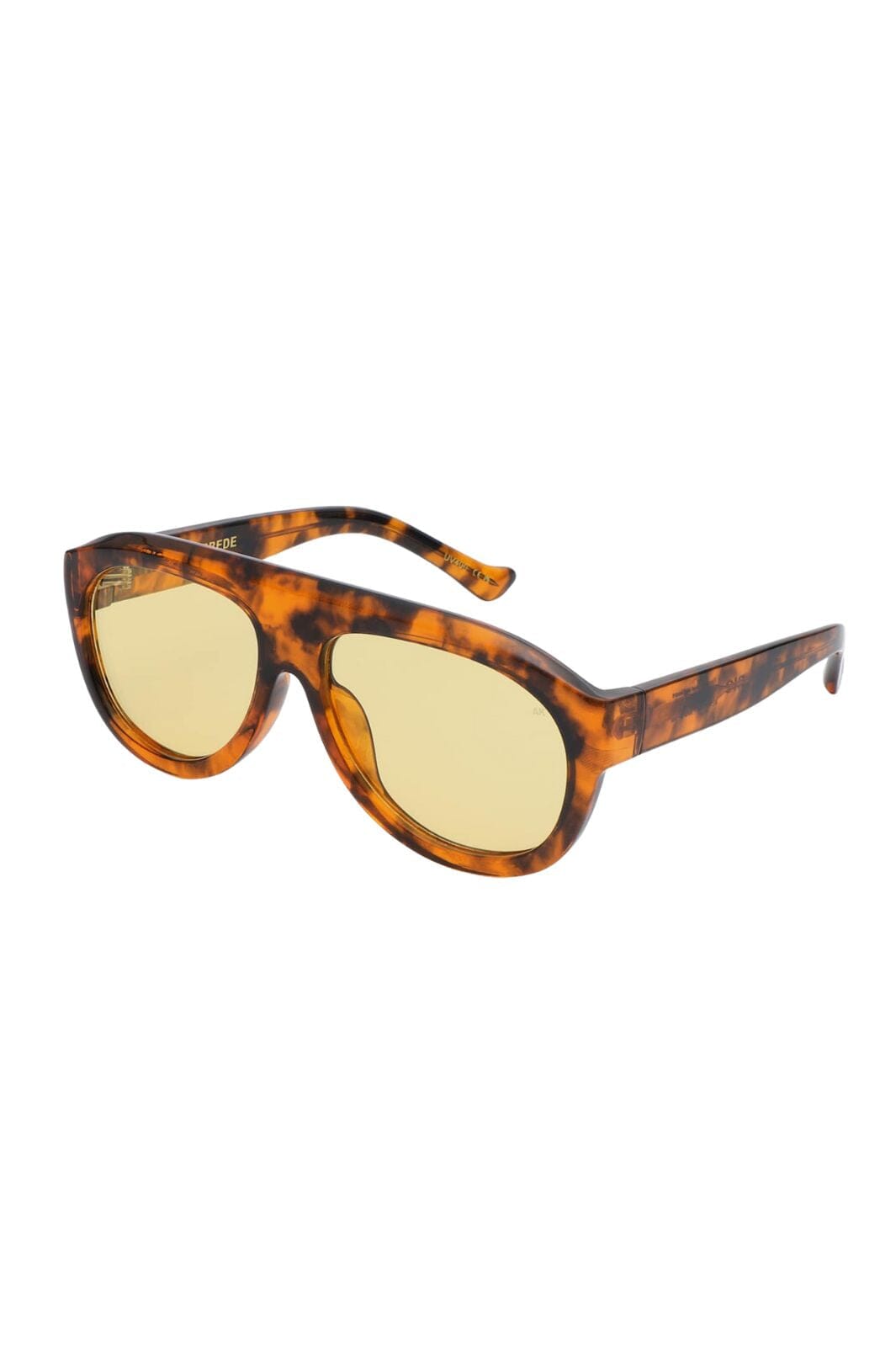 Sunglasses från A. Kjærbede med orange, bruna och gula färgkombinationer. Ramen har en bred överkant och ett karaktäristiskt sköldpaddsmönster med gula linser.
