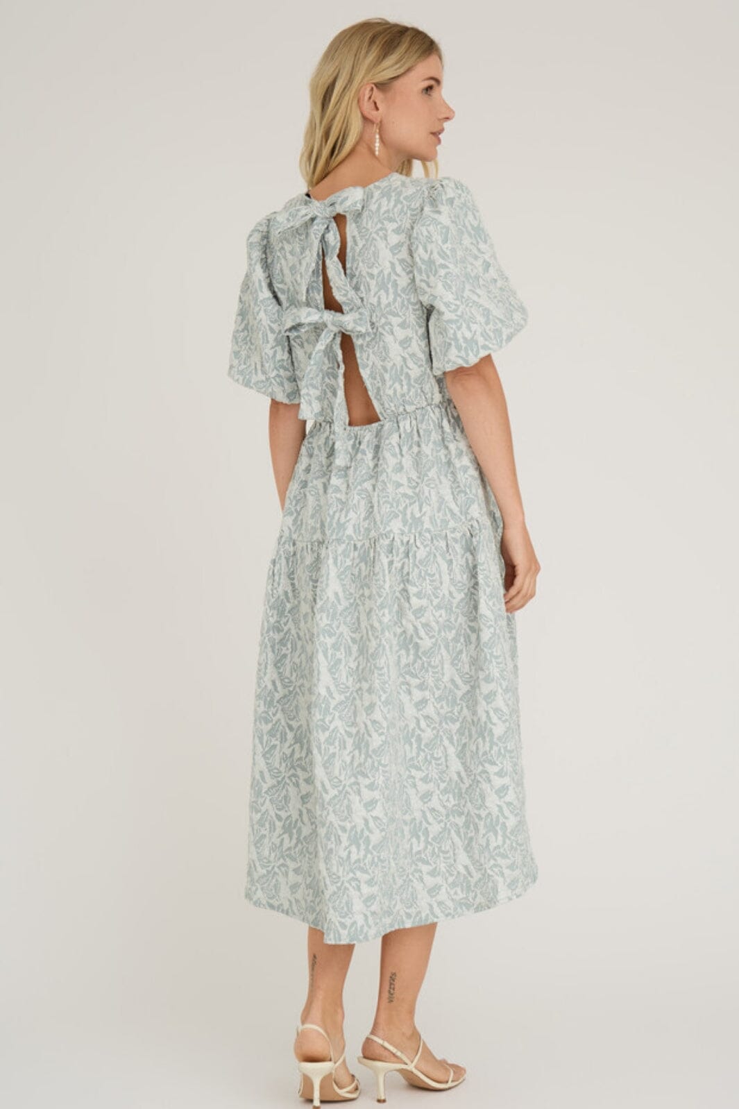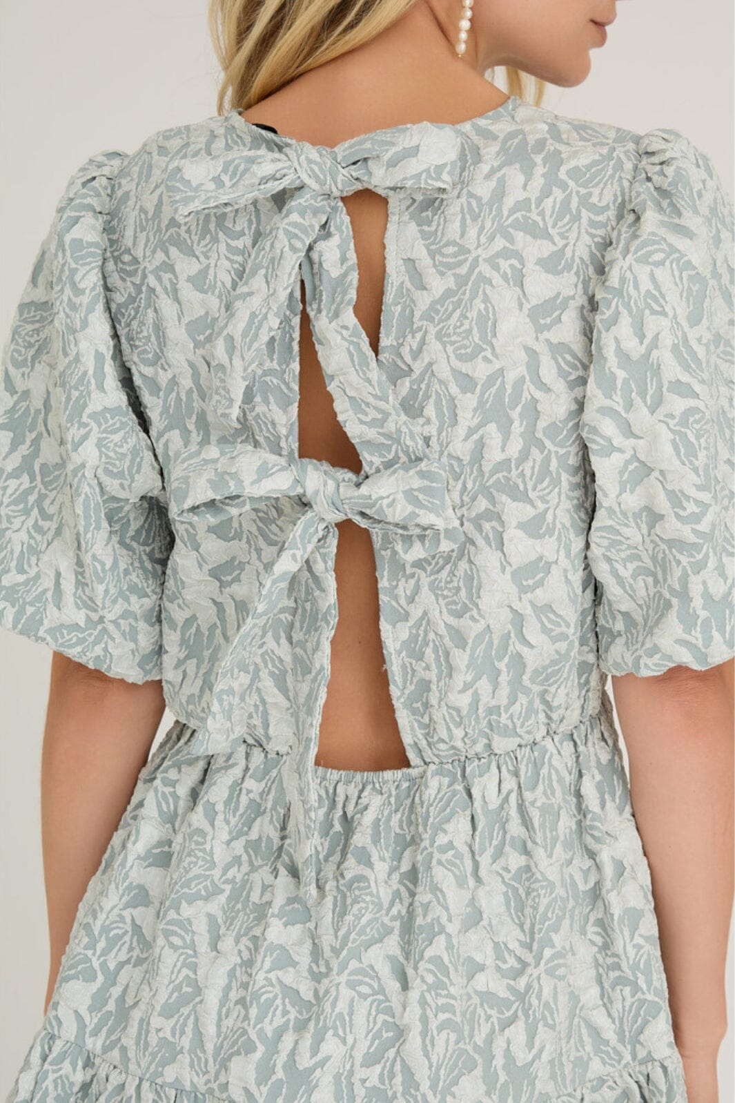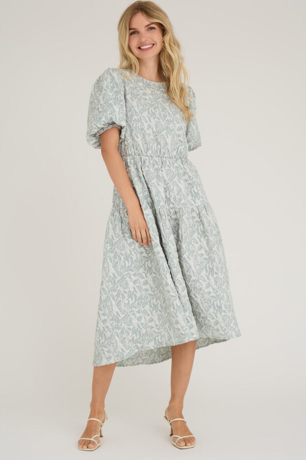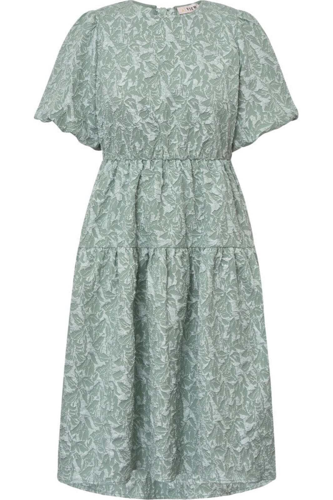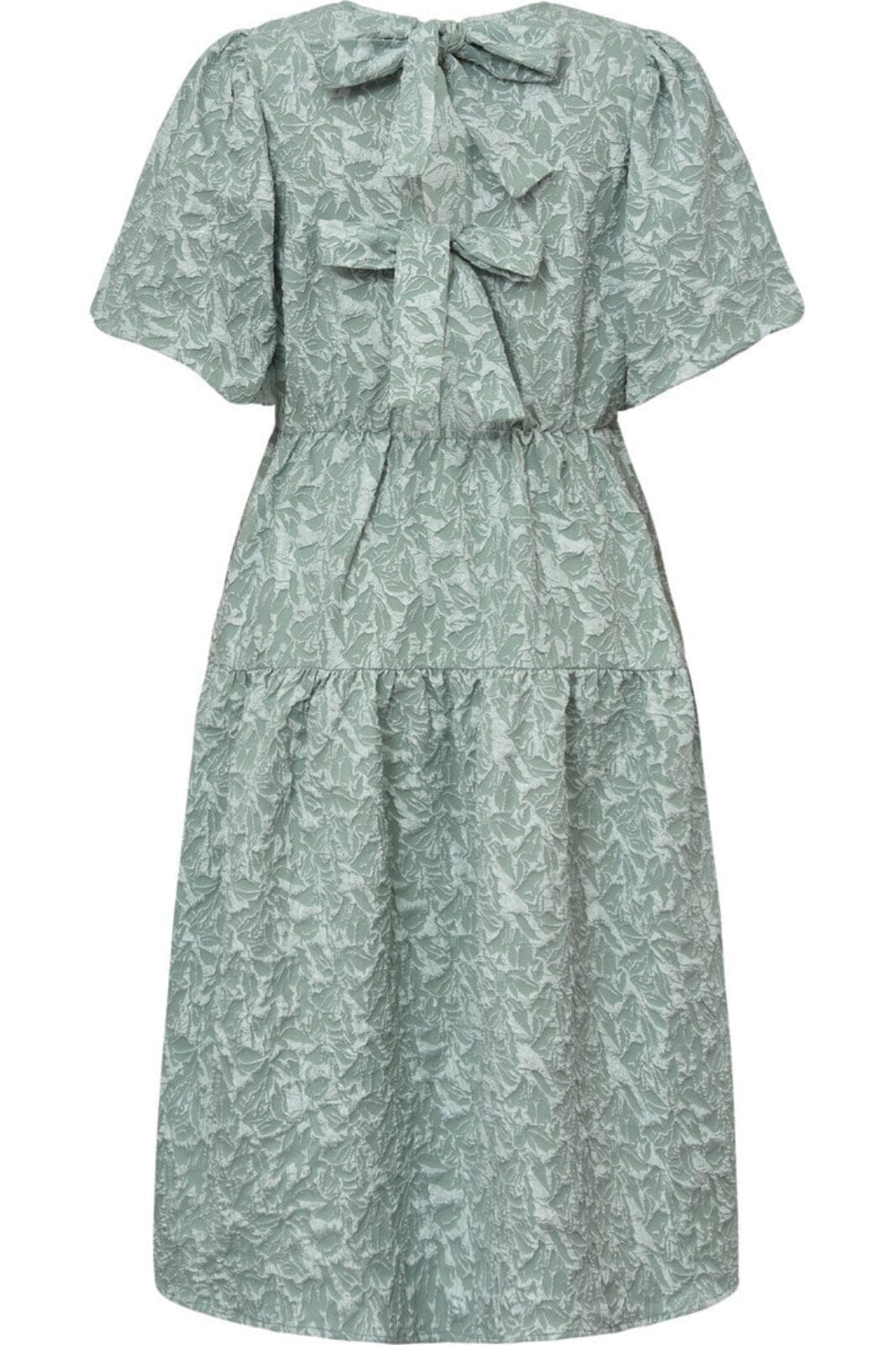Mintgrön klänning med blommönster från A-View. Den har puffärmar och en lager-på-lager kjol med peplumeffekt. Baksidan har en öppen skärning med bindband.