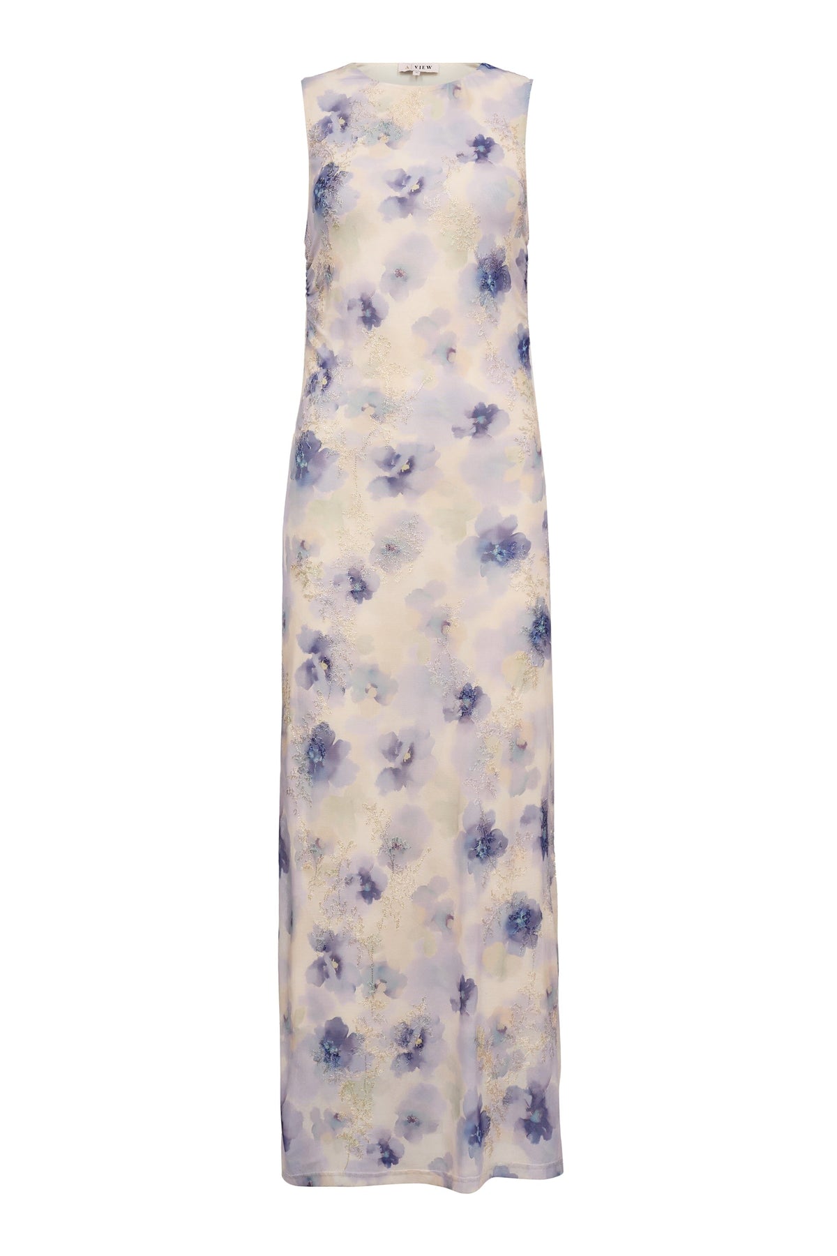 Ärmlös klänning från A-View med lila och gult blommönster. Klänningen är gjord i mesh-kvalitet och har en längd strax ovanför knäet.