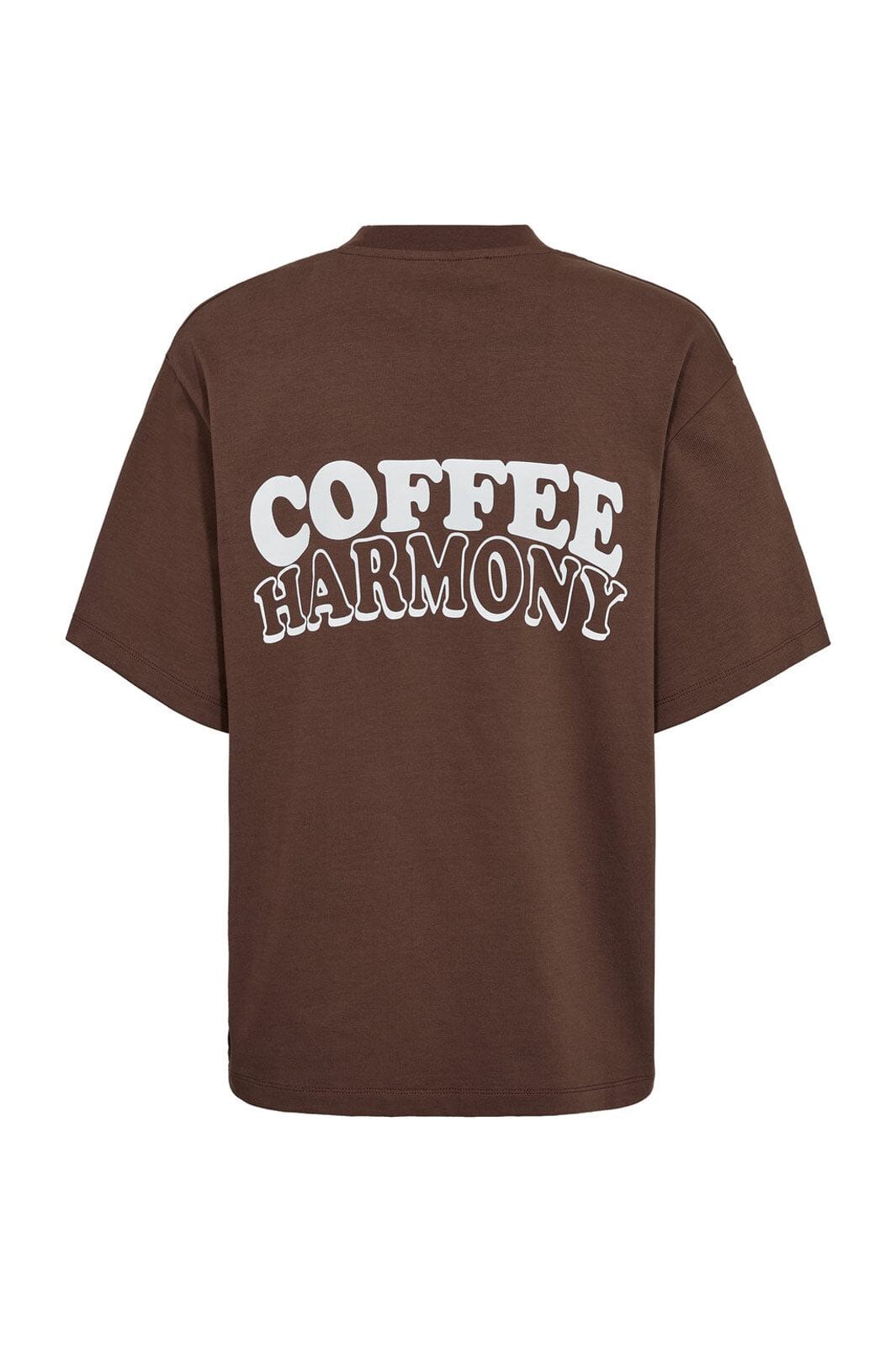 Brun t-shirt från A-View med ett stort COFFEE HARMONY-tryck på ryggen. T-shirten har en lös passform och är gjord av ekologisk bomull med rund hals.