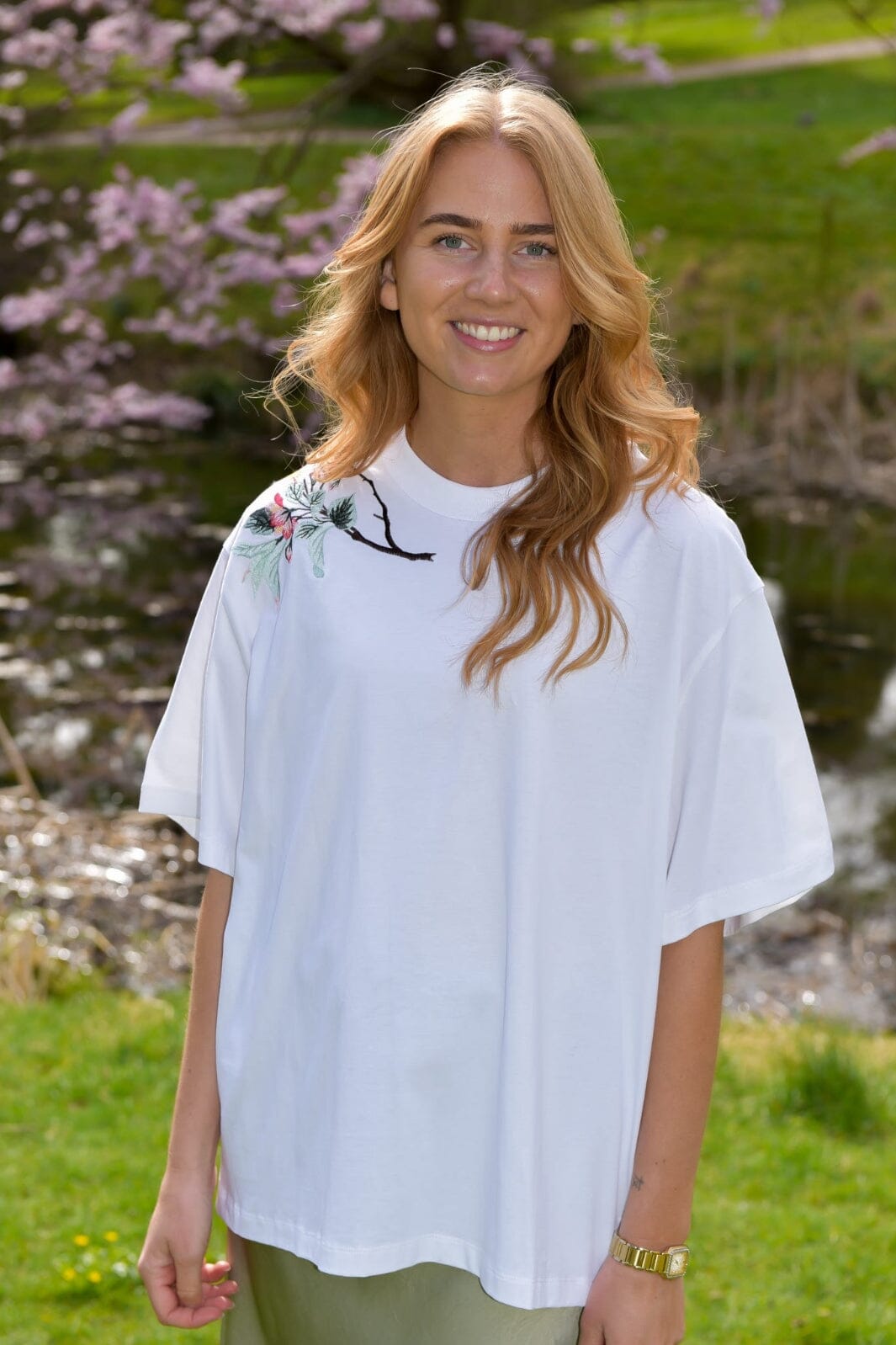 - 100% Ekologisk bomull, rund halsringning, broderad blomma på axeln