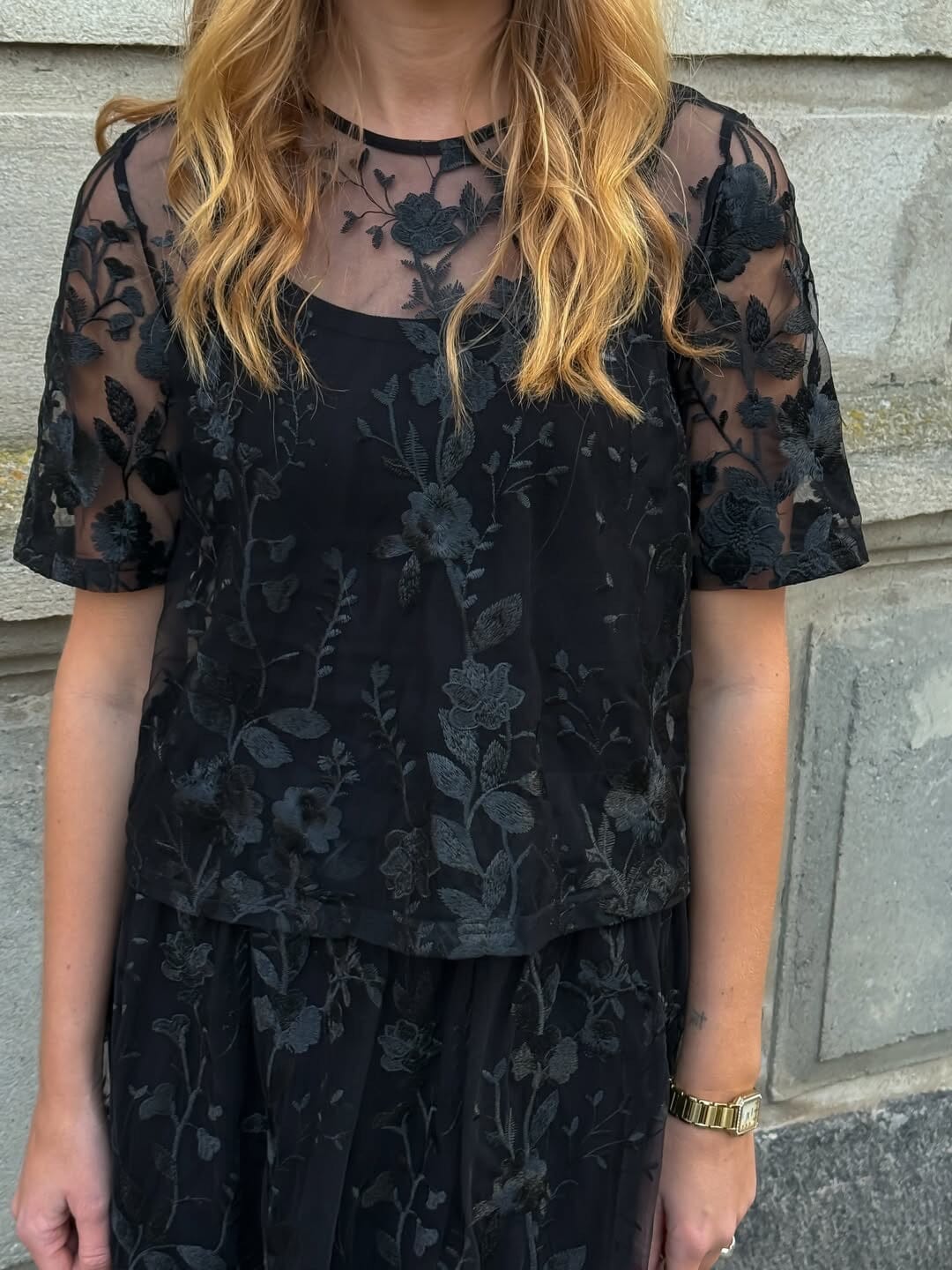 Svart blus från A-View, tillverkad av transparent mesh med broderade blommor. Blusen har korta, vida ärmar och en rund halsringning.