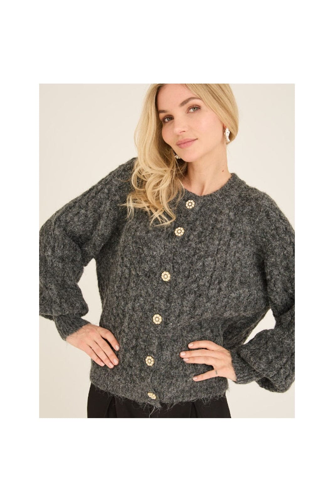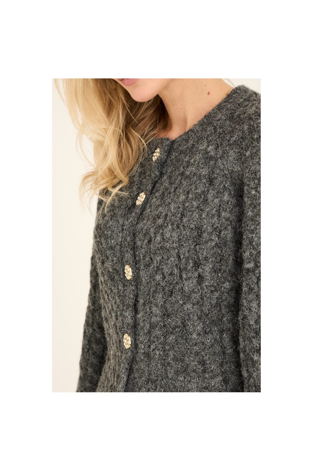 Mörkgrå stickad cardigan från A-View med rund hals och lös passform. Cardiganen har dekorativa sömmar och pärlknappar som ger den en unik karaktär.