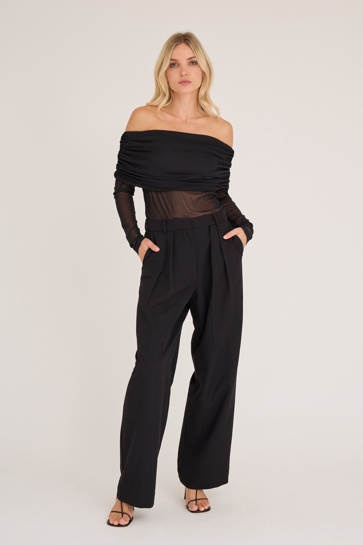 Svart blus från A-View med off-shoulder-design. Den rynkade överdelen och de genomskinliga mesh-ärmarna gör blusen lämplig för festliga tillfällen.