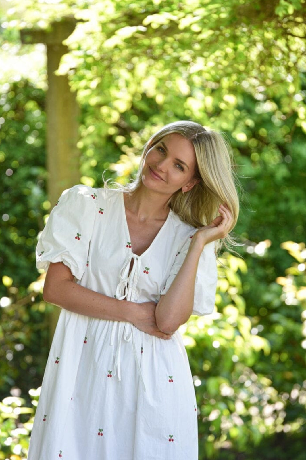 Vit klänning från A-View i 100 % bomull. Klänningen har korta puffärmar, V-ringning med rosett framtill och diskret körsbärsbroderi över hela klänningen.