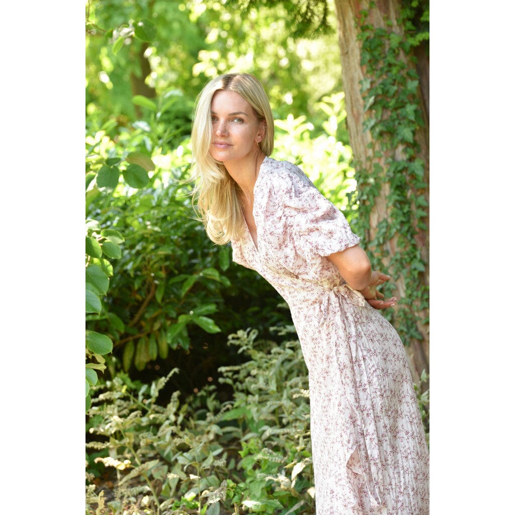 Klänning från A-View med blommigt tryck i rosa nyanser. Klänningen har puffiga, korta ärmar och en V-ringning med omlottdesign.
