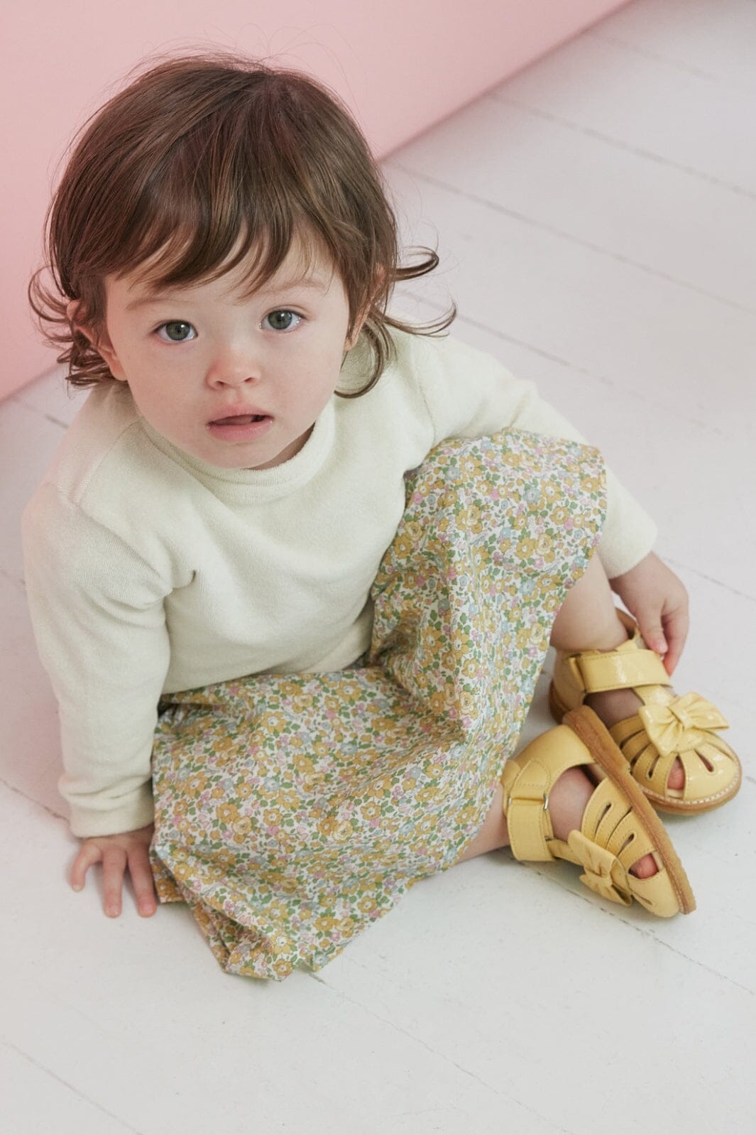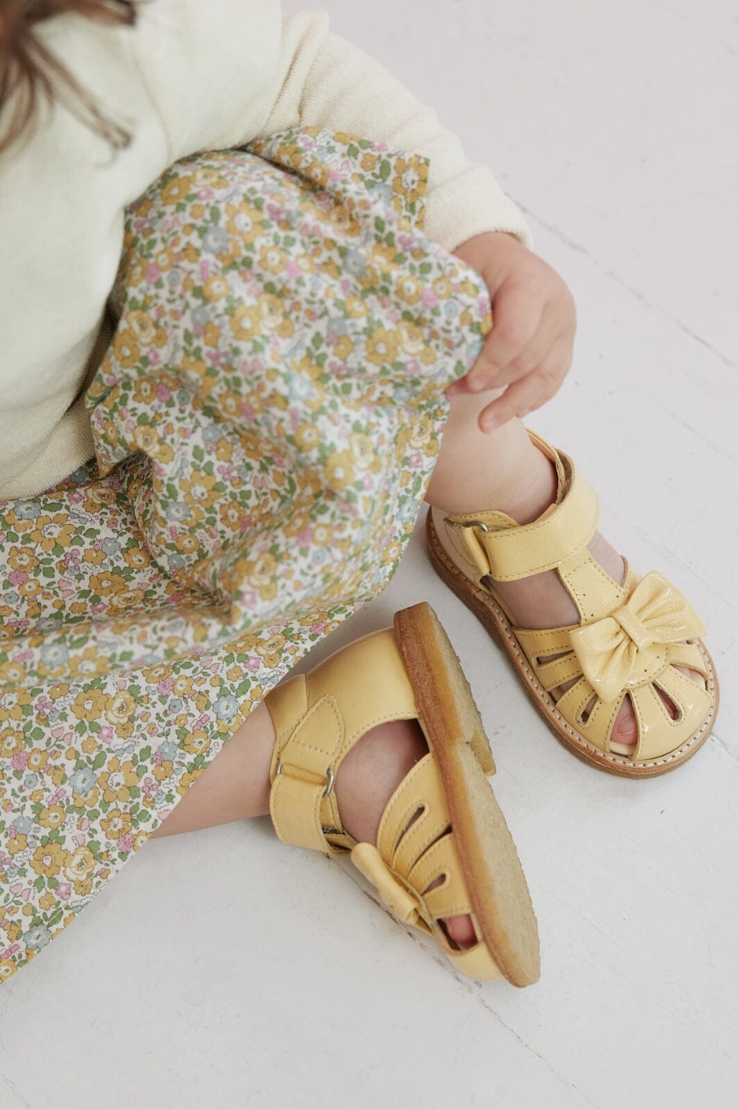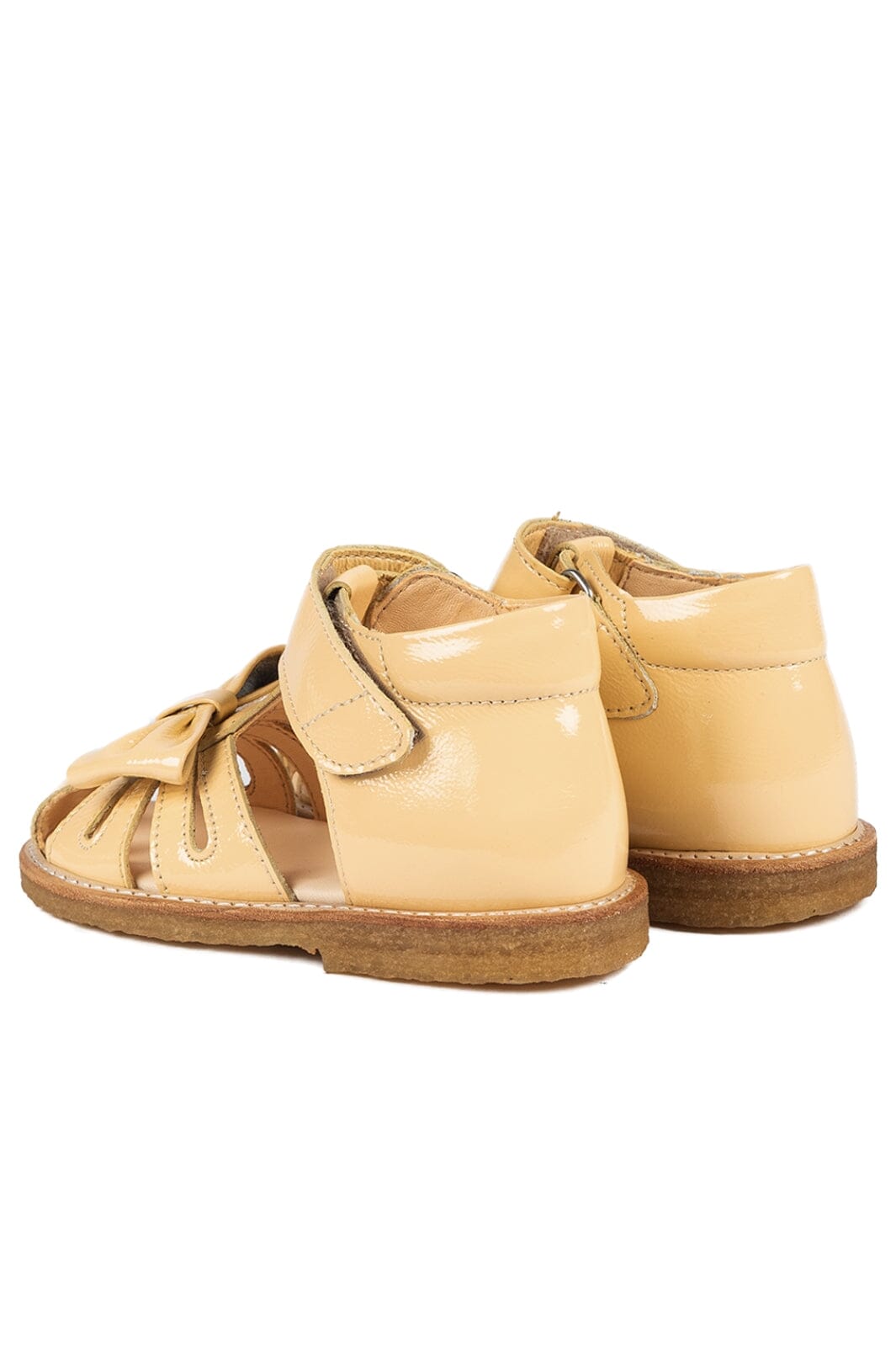 Gula sandaler från Angulus med lackfinish och rosett-detalj. Sandalerna har en öppen design med utskärningar och en praktisk kombination av kardborre och spänne-stängning.
