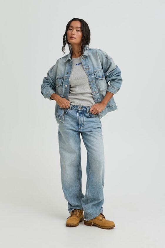 Denimjacka från Ball i en ljusblå nyans. Jackan är tillverkad av 100 % bomull och har en oversized passform. Den har dekorativa sömmar och ett stort logotryck på ryggen.