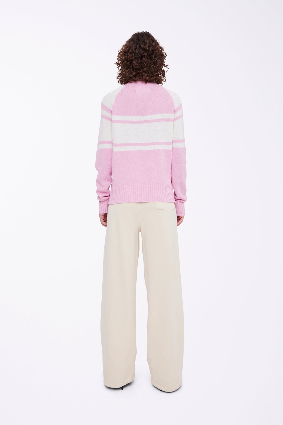 Stickad tröja från Ball i rosa melange med vita ränder. Den har en rund halsringning och en svart BALL-logotyp på bröstet som skapar kontrast till de ljusa färgerna.