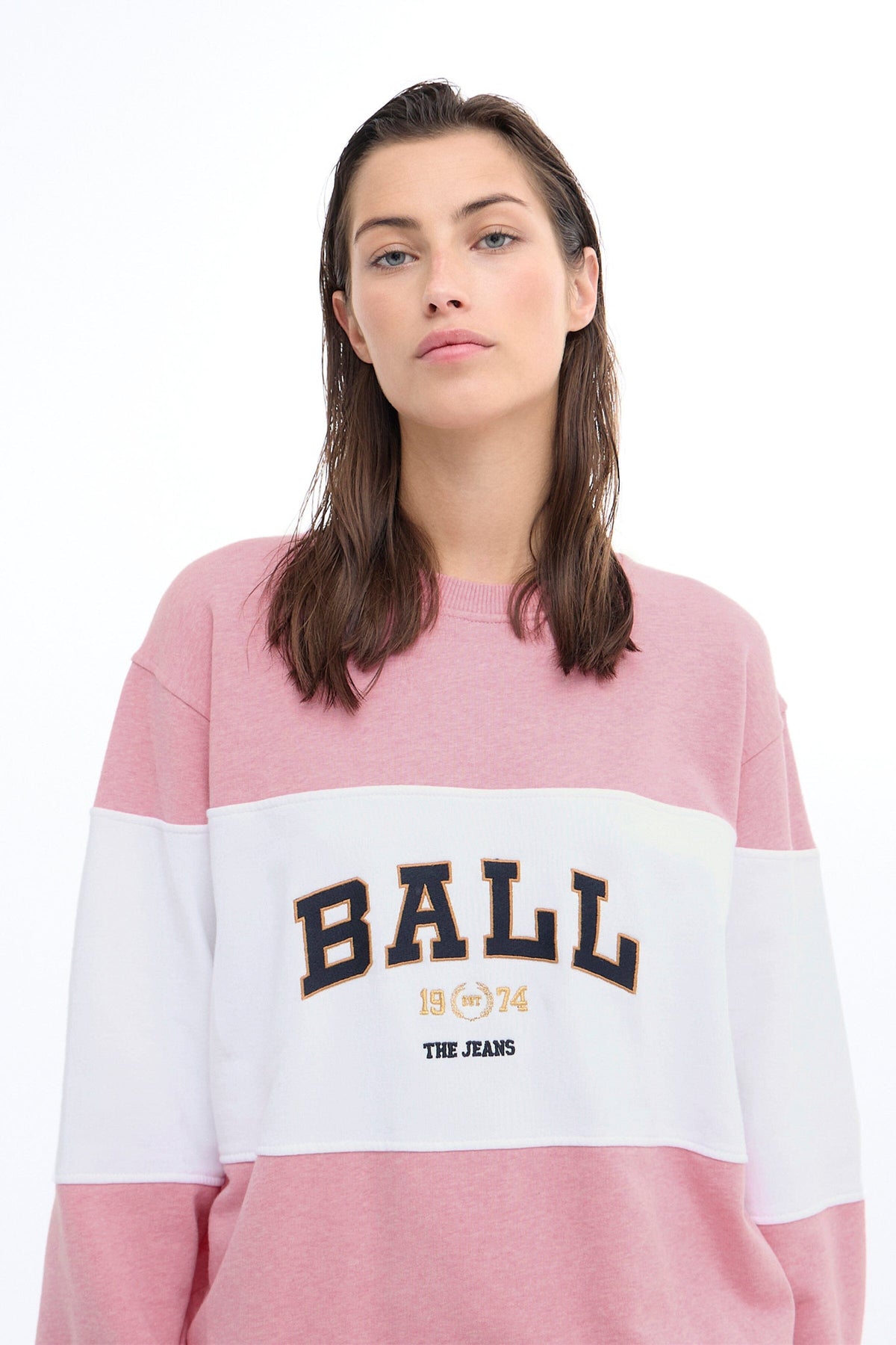 Sweatshirt från Ball i rosa melange med vitt färgblockdesign. Den har en lös passform och en broderad logotyp på bröstet med texten BALL och årtalet 1974.