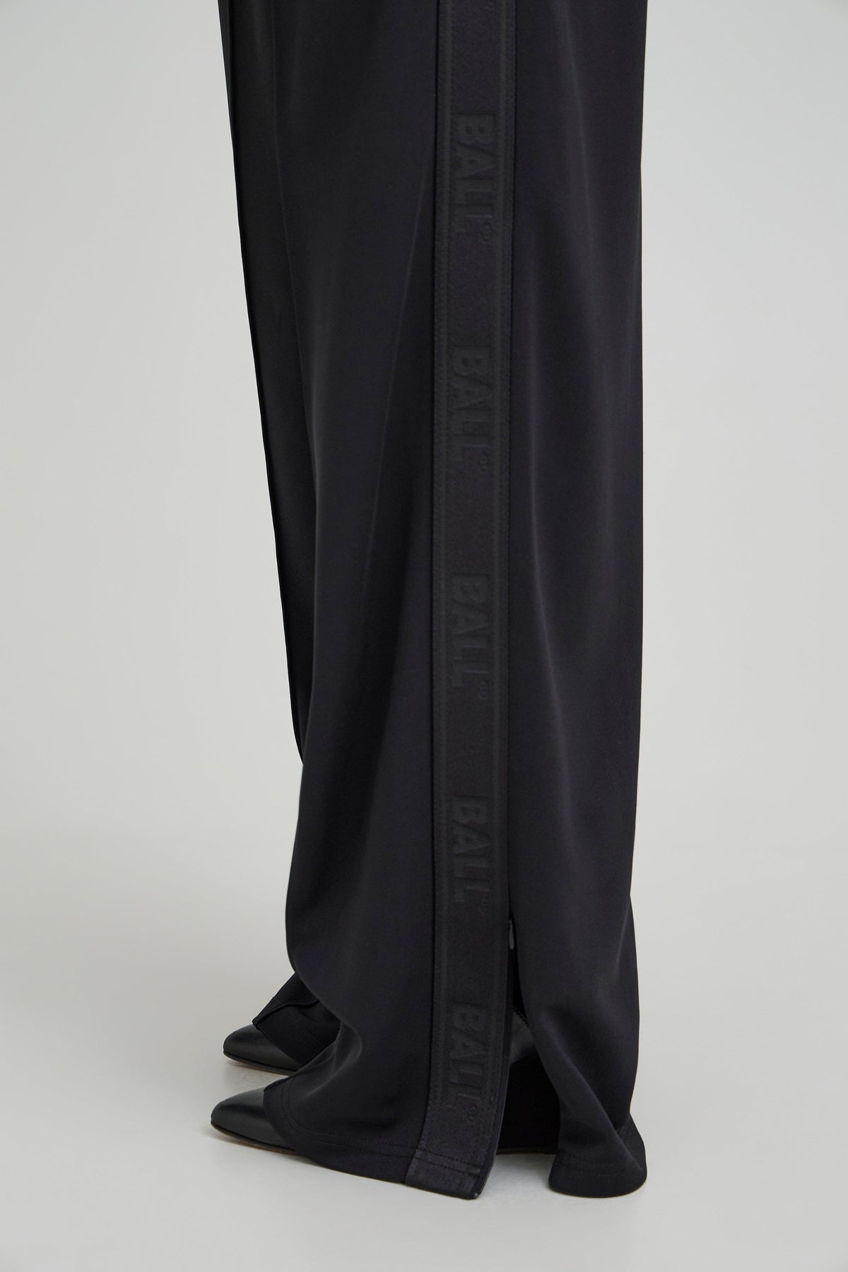 Svarta trackpants från Ball, tillverkade av 100 % polyester. Byxorna har en lös passform och en lång längd ned till golvet.