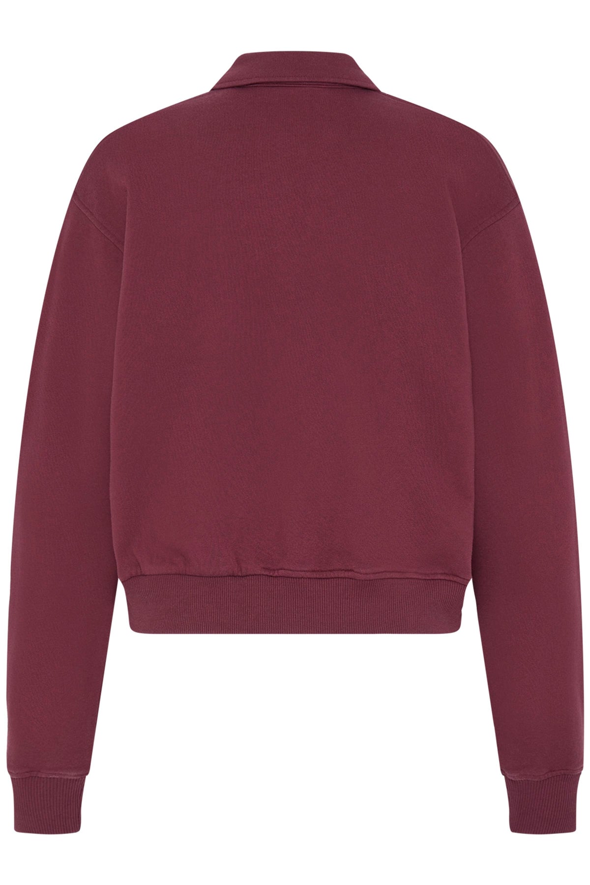 En polotröja från Ball, tillverkad av 100 % bomull i en mörk bordeauxnyans. Tröjan har en klassisk polokrage med tre knappar.