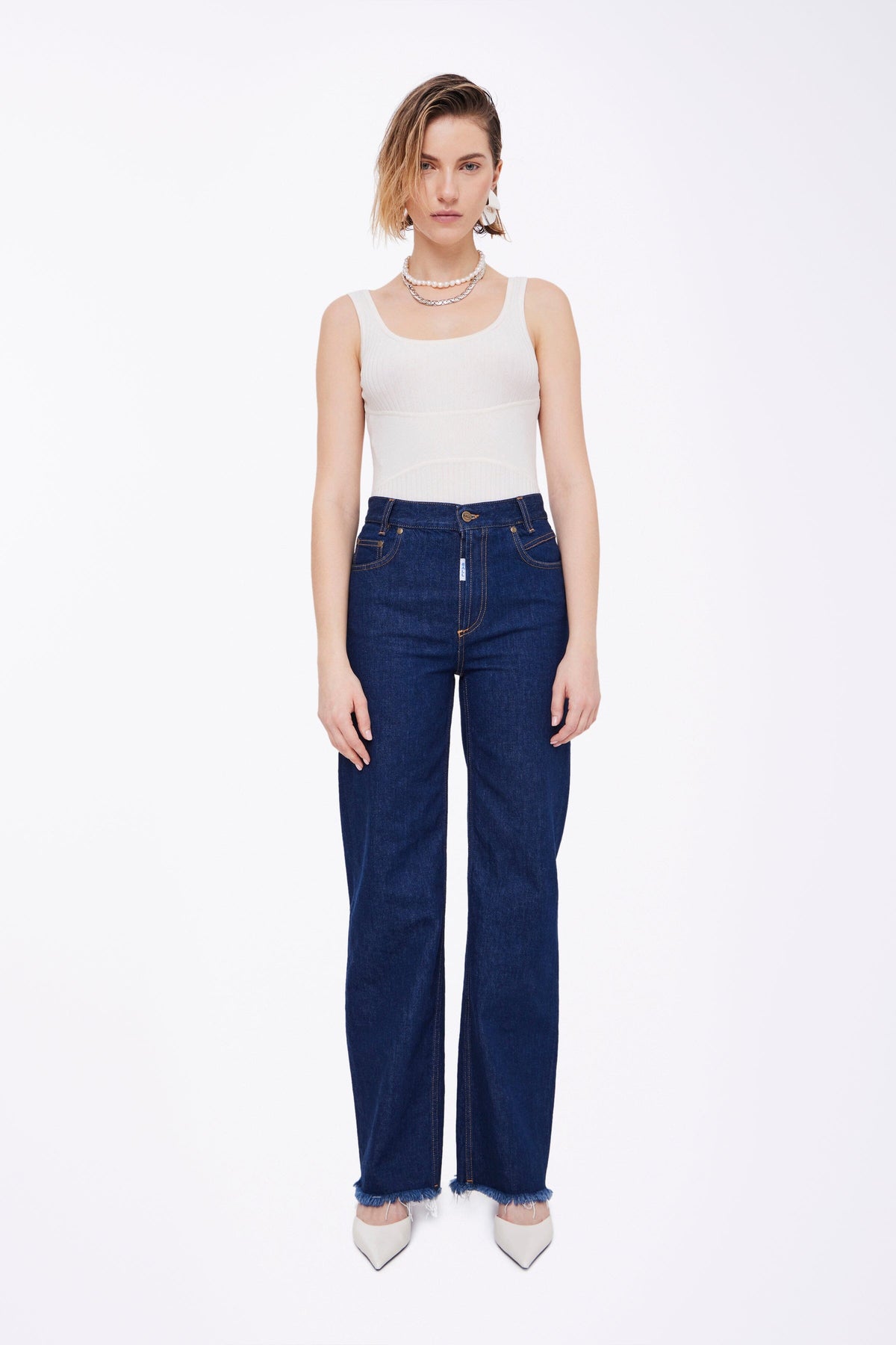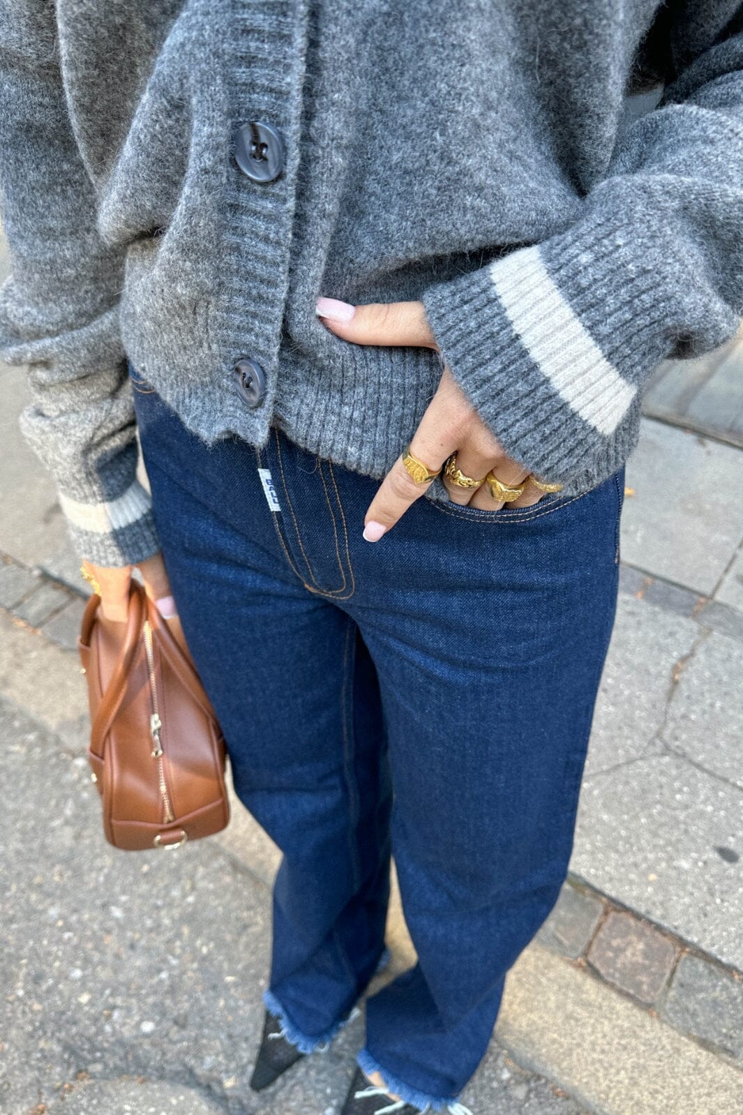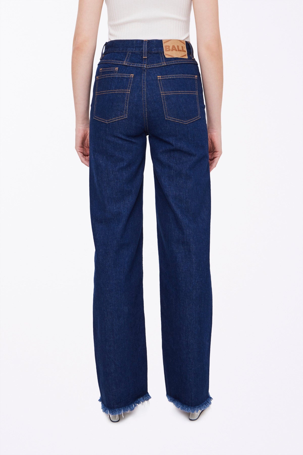 Jeans från Ball i mörkblå rinse wash. Byxorna har vida ben med fransade kanter nederst och dekorativa sömmar på fickorna.