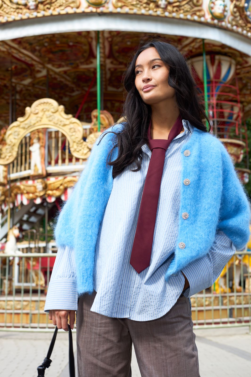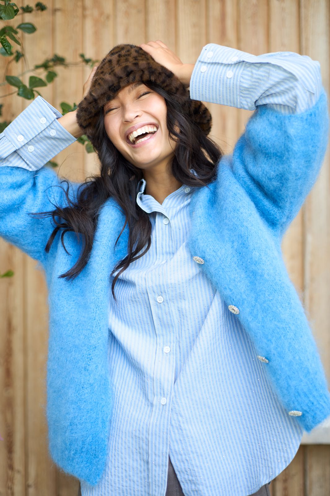 Stickad cardigan från Black Colour i ljusblått. Den mjuka mohair-cardigan har en lös passform med 3/4-ärmar och knappstängning fram med dekorativa knappar.