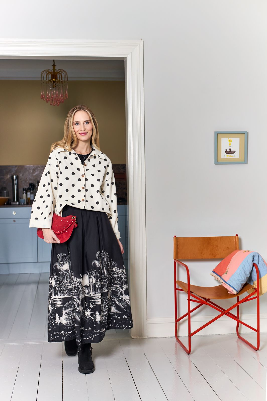 Skjortjacka från Black Colour, tillverkad i vit bomull med svarta prickar. Jackan har en klassisk skjortkrage och knäppning framtill.