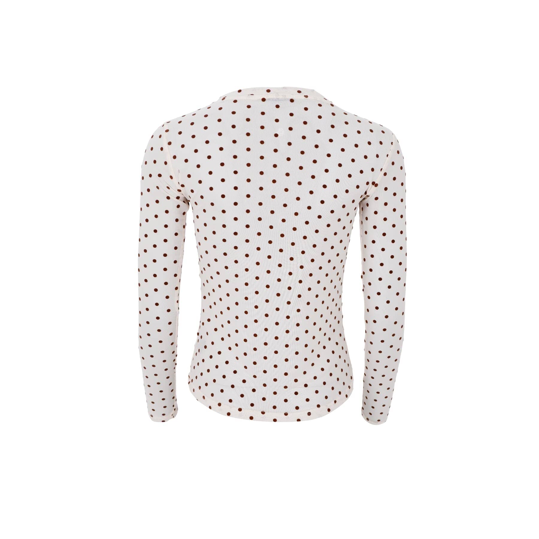 Meshblus från Black Colour i ljus cremefärg med svarta prickar. Blusen har hög hals, långa ärmar och en slim fit.