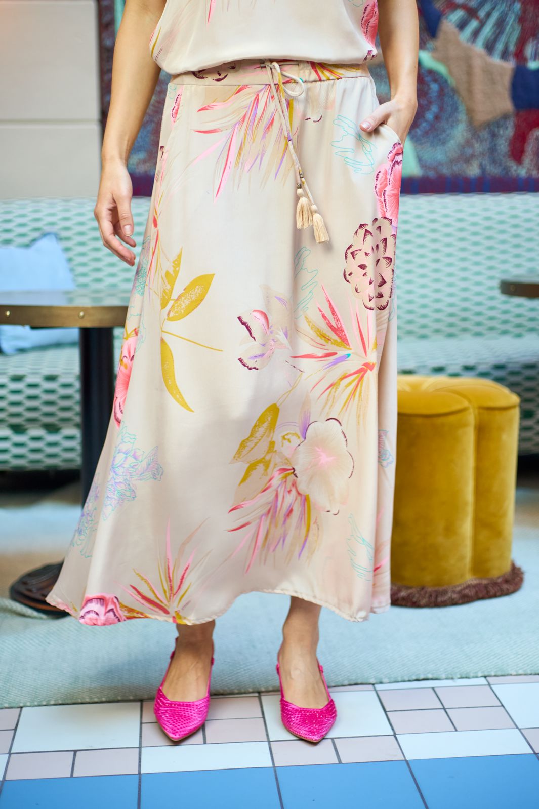Kjol från Black Colour med ett färgstarkt blommönster i ljusa nyanser. Kjolen har en lös passform och går till mitten av vaden.