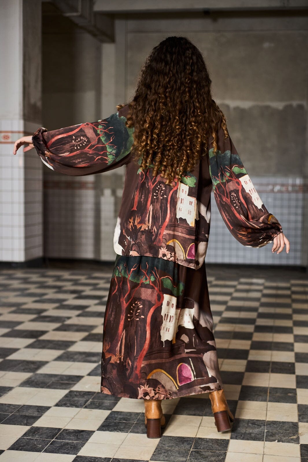 Brun blus från Black Colour med konstnärligt stadsmotiv. Den lösa modellen har V-ringning och långa ärmar med elastik vid handlederna. Mönstret visar byggnader och träd i flera färger.