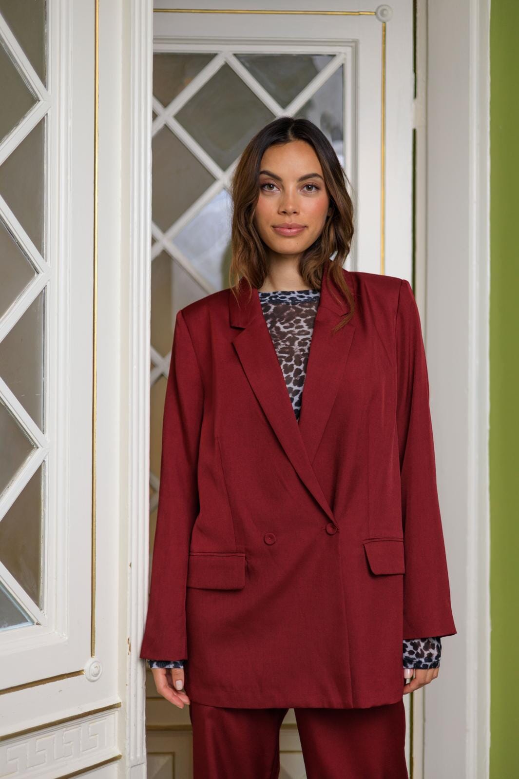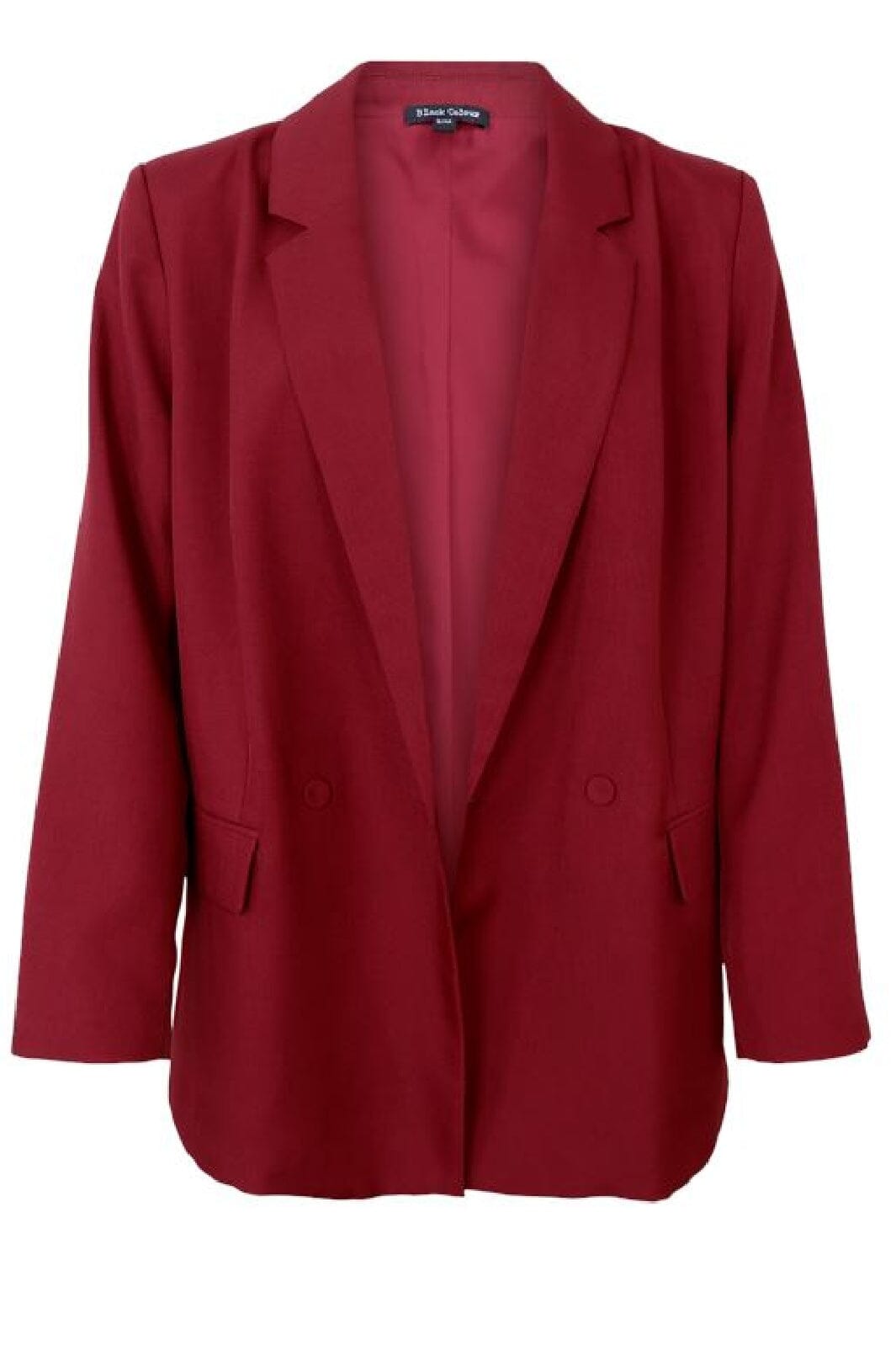 Vinröd blazer från Black Colour med oversized passform. Den rymliga silhuetten kombinerar en avslappnad och formell look med klassisk skjortkrage och dubbla knappar.