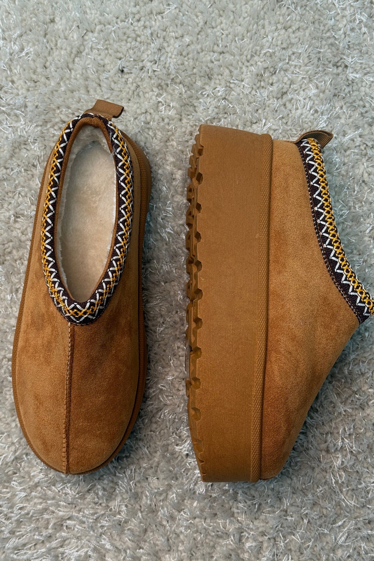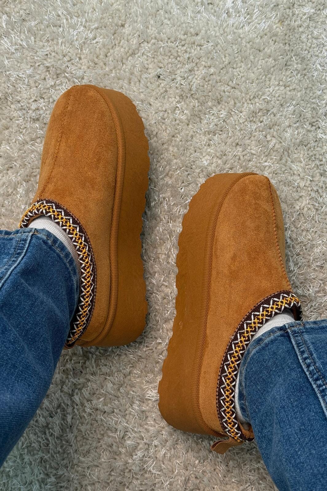 Tofflor från Bloom med kilklack i en varm brun nyans. Tillverkade av 100 % syntetiskt material med rund tåform.