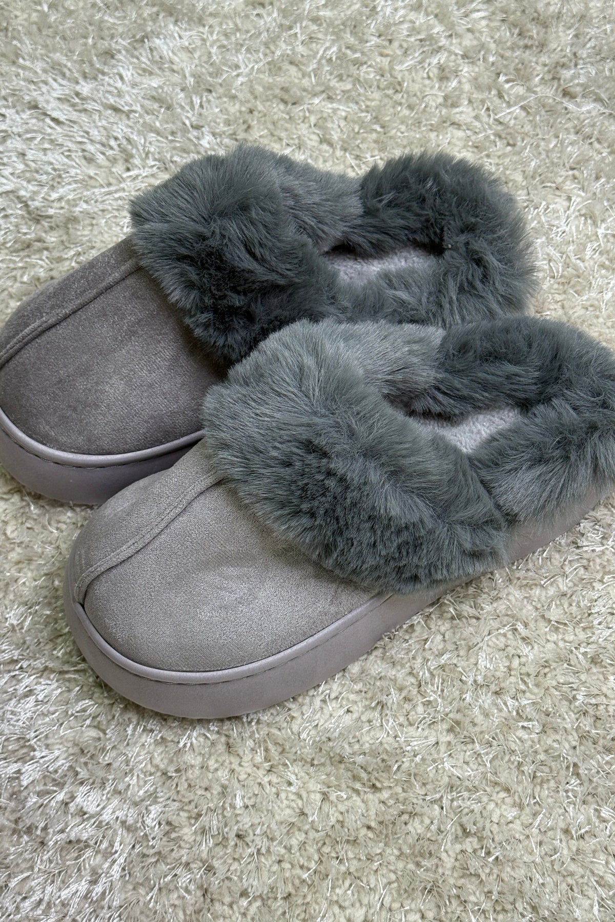 En ljusgrå toffel från Bloom, tillverkad av syntetiskt material. Toffeln har en låg klack och en rund tå.