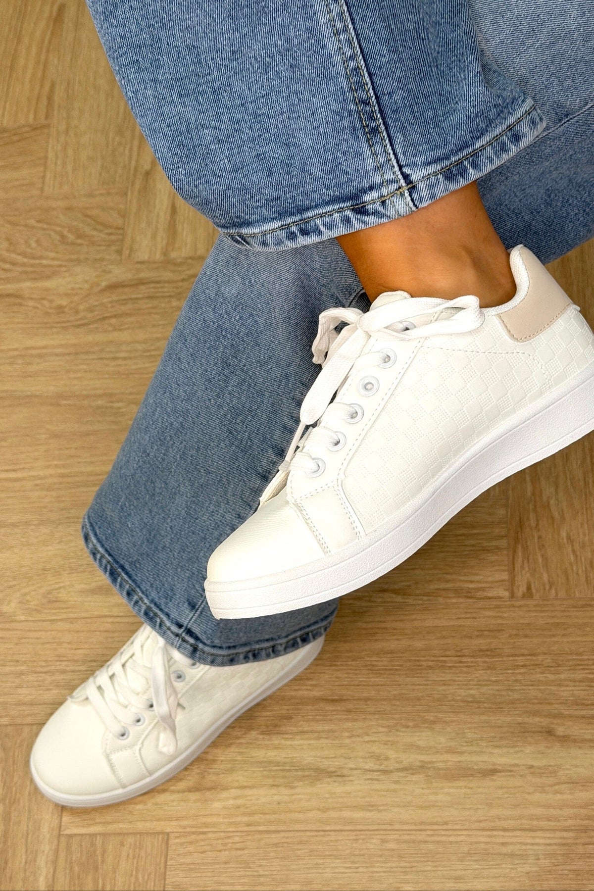 Sneakers från Bloom i vitt med beige detaljer på hälen. En klassisk lågprofilmodell med snörning och rund tå.